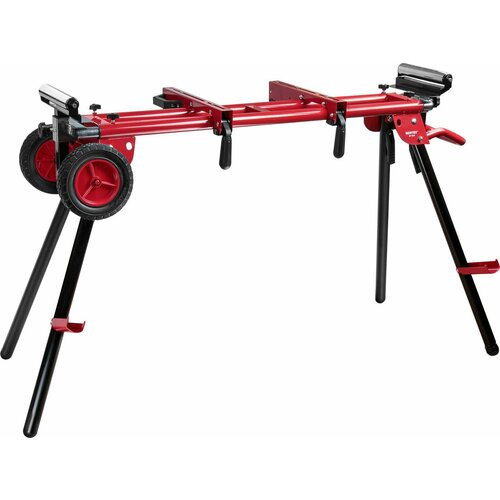 Благодаря складной конструкции стол удобно хранить. Две ножки стола оснащены регулируемыми упорами для заготовок. Верстак оснащен колёсами и рукояткой для удобного перемещения вместе с закреплённой пилой или без неё. Одна из ножек регулируется по высоте для лучшего упора и устойчивости стола.