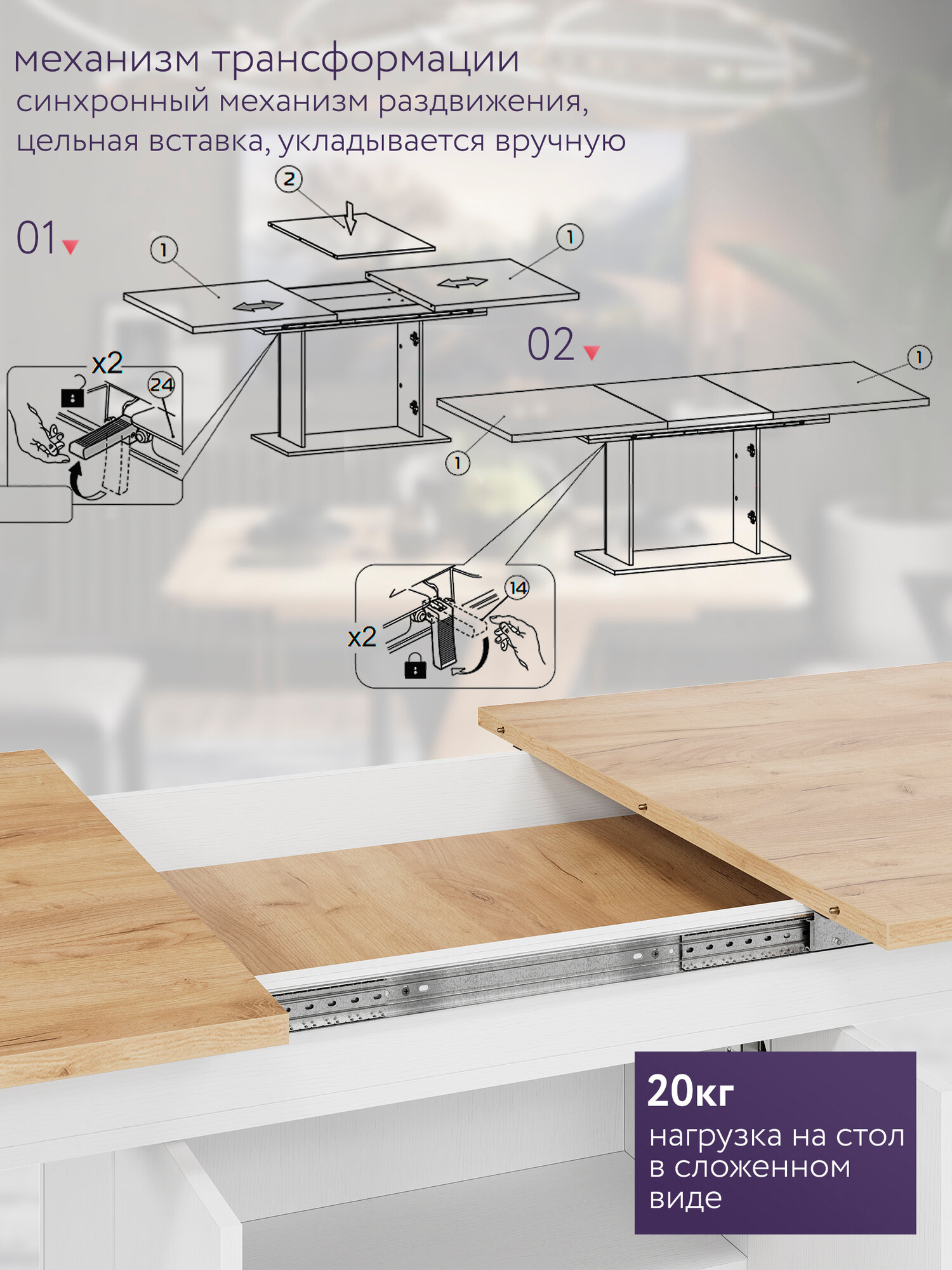 Раздвижной обеденный стол - идеальное решение для людей, которые часто любят принимать гостей, но стремятся сохранить больше свободного пространства на кухне или в обеденной зоне. Стол Тайлер представлен в уникальном современном дизайне и впишется в цвета любого интерьера, благодаря представленным расцветкам. Кухонный стол имеет ящик в его основании для хранения кухонной утвари, посуды и др. Размеры ящика в основании: в глубину - 26, 4 см, в ширину 59,2, в высоту - 59,2 см, высота между полками - 28,2 см. Ящик открывается с помощью механизма нажатия Push to Open. Механизм трансформации стола - синхронный раздвижной с цельной вставкой. Длина стола до трансформации -150,4 см, после трансформации - 201,4 см. За разложенный стол комфортно уместится 8 человек. Толщина столешницы - 22 мм, качественные материалы делают стол износостойким, способным прослужить многие годы - используется экологический безопасный ЛДСП высокого качества, кромка - ПВХ. Раздвижные столы, установленные на кухне, благодаря раздвижной конструкции обеденной плоскости, эффективно экономят пространство. Они вносят порядок и гармонию, удобство и практичность, являясь идеальным вариантом для малогабаритных комнат. Поставляется в разобранном виде. В комплекте идет схема сборки и фурнитура, все технические отверстия сделаны на производстве.