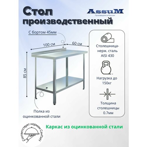 Стол производственный сборно-разборный открытый пристенный, серии Standart, с бортом высотой 45мм, столешницей из пищевой шлифованной нержавеющей стали AISI430 толщиной 0,7мм оснащён подложкой из ламинированного ДСП толщиной 16мм, рамкой столешницы из оцинкованной стали толщиной 1,5мм, Z-образными креплениями столешницы из нержавеющей стали толщиной 0,7мм, нижней сплошной полкой из оцинкованной стали толщиной 0,7мм, разборным каркасом из оцинкованного гнутого углового профиля 40х40мм толщиной 1,5мм, регулируемыми по высоте пластиковыми опорами ножек. Максимальная равномерно распределенная нагрузка на столешницу - до 150кг. Этот стол обладает всеми качествами, необходимыми для использования в производственных целях и на кухне. Изготовлен из прочной и долговечной нержавеющей стали, он обеспечит надежную поддержку для вашей работы. Металлическая конструкция этого стола, усиленная ДСП, придает ему дополнительную прочность и устойчивость. Сочетание нержавеющей стали и металла создает идеальное оборудование для производственных нужд.