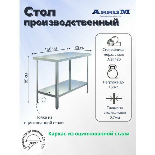 Стол производственный сборно-разборный открытый центральный, серии Standart, без борта, со столешницей из пищевой шлифованной нержавеющей стали AISI430 толщиной 0,7мм оснащён подложкой из ламинированного ДСП толщиной 16мм, рамкой столешницы из оцинкованной стали толщиной 1,5мм, нижней полкой из оцинкованной стали толщиной 0,7мм, разборным каркасом из уголка 40х40мм толщиной 1,5мм из оцинкованной стали, регулируемыми по высоте пластиковыми опорами ножек, Максимальная равномерно распределенная нагрузка на столешницу - до 150кг, Этот стол обладает всеми качествами, необходимыми для использования в производственных целях и на кухне. Изготовлен из прочной и долговечной нержавеющей стали, он обеспечит надежную поддержку для вашей работы. Металлическая конструкция этого стола, усиленная ДСП, придает ему дополнительную прочность и устойчивость. Сочетание нержавеющей стали и металла создает идеальное оборудование для производственных нужд.