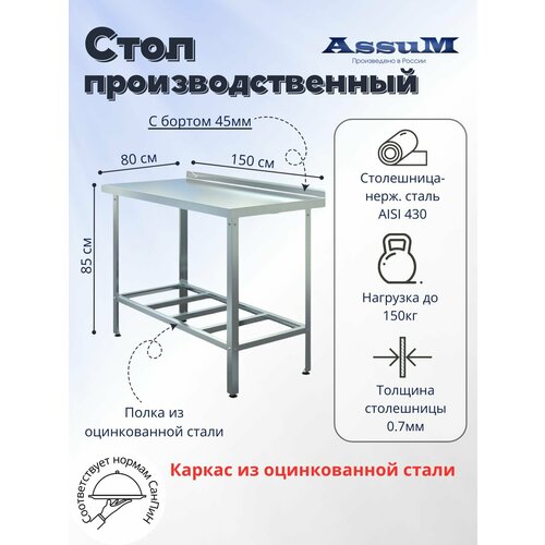 Стол производственный сборно-разборный открытый пристенный, серии Стандарт, с бортом высотой 45мм оснащён рамкой столешницы из оцинкованной стали толщиной 1,5мм, полкой-решеткой из оцинкованной стали толщиной 0,7мм. Столешница из нержавеющей стали AISI 430 толщиной 0,7мм усилена ламинированным ДСП толщиной 16мм. Максимальная равномерно распределенная нагрузка на столешницу - до 150кг. Ножки стола изготовлены из оцинкованной стали (уголок 40х40мм) толщиной 1,5мм. Регулируемые по высоте пластиковые опоры позволяют компенсировать неровности пола. Отступ ног - 50мм. Этот стол обладает всеми качествами, необходимыми для использования в производственных целях и на кухне. Изготовлен из прочной и долговечной нержавеющей стали, он обеспечит надежную поддержку для вашей работы. Металлическая конструкция этого стола, усиленная ДСП, придает ему дополнительную прочность и устойчивость. Сочетание нержавеющей стали и металла создает идеальное оборудование для производственных нужд.