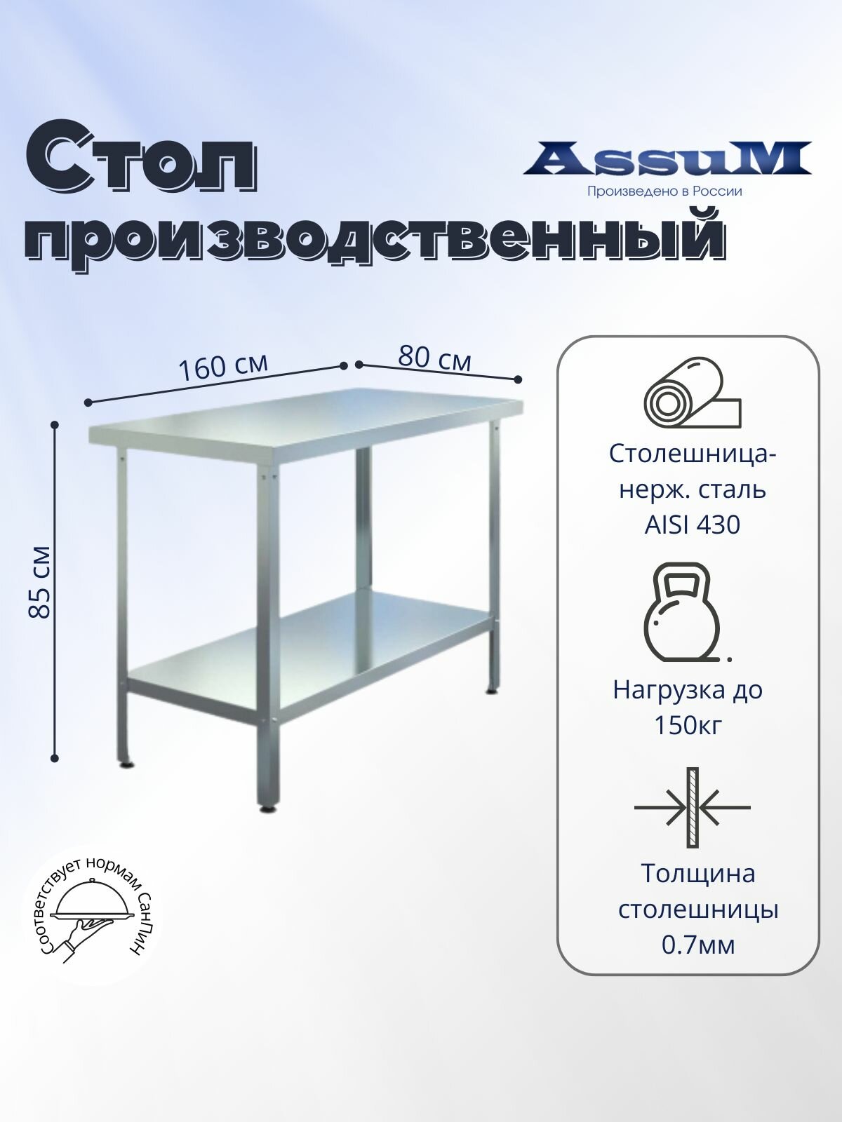 Стол производственный сборно-разборный открытый центральный, серии Standart, без борта, со столешницей из пищевой шлифованной нержавеющей стали AISI430 толщиной 0,7мм оснащён подложкой из ламинированного ДСП толщиной 16мм, рамкой столешницы из оцинкованной стали толщиной 1,5мм, нижней полкой из оцинкованной стали толщиной 0,7мм, разборным каркасом из уголка 40х40мм толщиной 1,5мм из оцинкованной стали, регулируемыми по высоте пластиковыми опорами ножек, Максимальная равномерно распределенная нагрузка на столешницу - до 150кг, Производственный стол Assum был разработан с акцентом на удобство и функциональность, что позволяет организовать рабочее пространство наиболее эффективно. Он обладает оптимальными размерами, обеспечивая достаточное место для размещения всех необходимых инструментов и материалов.