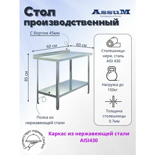 Купить Стол производственный Assum, 600х600х850мм, борт, открытый, 1 полка сплошная нерж.430, разборный, каркас уголок нерж.430 с доставкой по всей России.