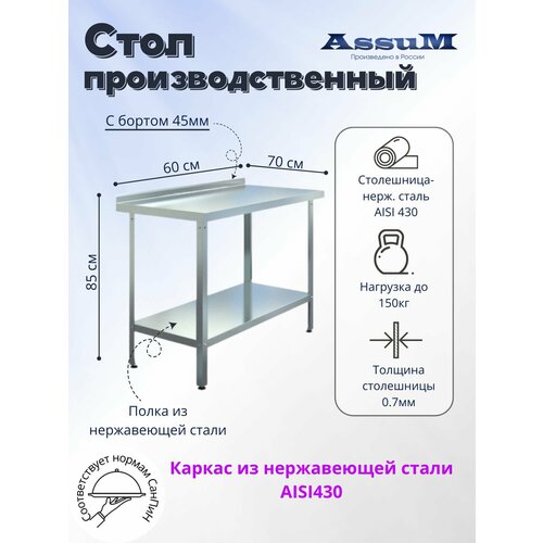 Стол производственный сборно-разборный открытый пристенный, серии Premium, с бортом высотой 45мм, оснащён рамкой столешницы из оцинкованной стали толщиной 1,5мм, Z-образными креплениями столешницы из нержавеющей стали толщиной 0,7мм, сплошной нижней полкой из нержавеющей стали AISI 430 толщиной 0,7мм. Столешница из AISI 430 толщиной 0,7мм усилена ламинированным ДСП толщиной 16мм. Максимальная равномерно распределенная нагрузка на столешницу - до 150кг. Полка усилена рёбром жесткости из нержавеющей стали толщиной 0,7мм. Ножки стола изготовлены из нержавеющей стали AISI 430 (уголок 40х40мм) толщиной 1,5мм. Регулируемые по высоте пластиковые опоры позволяют компенсировать неровности пола. Ножки отгружаются отдельно. Производственный стол из нержавеющей стали - это неотъемлемый элемент любого современного предприятия, лаборатории или производственного цеха. Созданный для обеспечения максимальной гигиеничности, прочности и долговечности, этот стол является идеальным решением для работы в агрессивных средах, где требуются высокие стандарты чистоты и устойчивости к коррозии.
