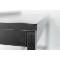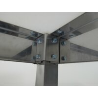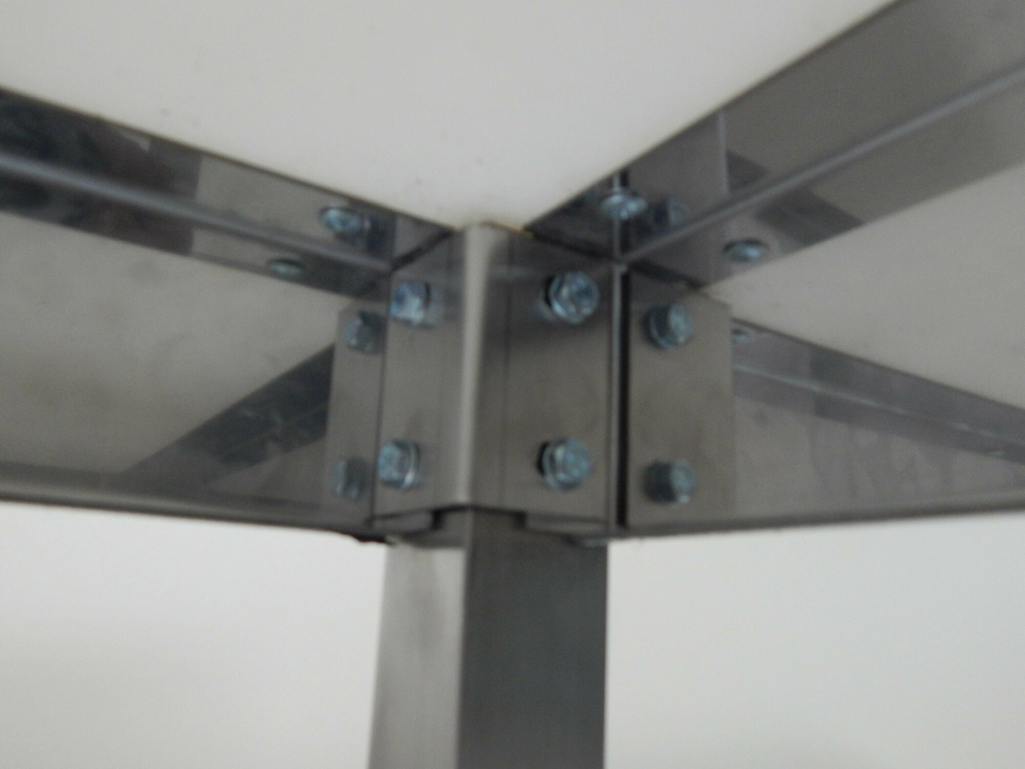 • столешница цельногнутая из шлифованной пищевой нержавеющей стали марки AISI 430 толщиной 0,5 мм, в защитной пленке; • усиление – подложка из ДСП 16 мм; • каркас – разборный, болтовое крепление; • материал изготовления каркаса – оцинкованная сталь, 1,5 мм; • ножки – гнутый угловой профиль с дополнительными подгибами и базирующими пуклевками; • стальные подпятники и регулируемые полиамидные опоры ножек; • нижняя перфорированная полка с усилением; • материал изготовления полки – оцинкованная сталь, 0,8 мм; • система фиксации деталей каркаса при сборке.