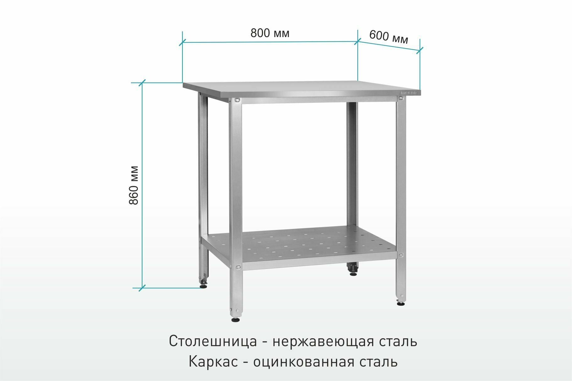 • столешница цельногнутая из шлифованной пищевой нержавеющей стали марки AISI 430 толщиной 0,5 мм, в защитной пленке; • усиление – подложка из ДСП 16 мм; • борт с вальцовкой; • каркас – разборный, болтовое крепление; • материал изготовления каркаса – оцинкованная сталь, 1,5 мм; • ножки – гнутый угловой профиль с дополнительными подгибами и базирующими пуклевками; • стальные подпятники и регулируемые полиамидные опоры ножек; • нижняя перфорированная полка с усилением; • материал изготовления полки – оцинкованная сталь, 0,8 мм; • система фиксации деталей каркаса при сборке.