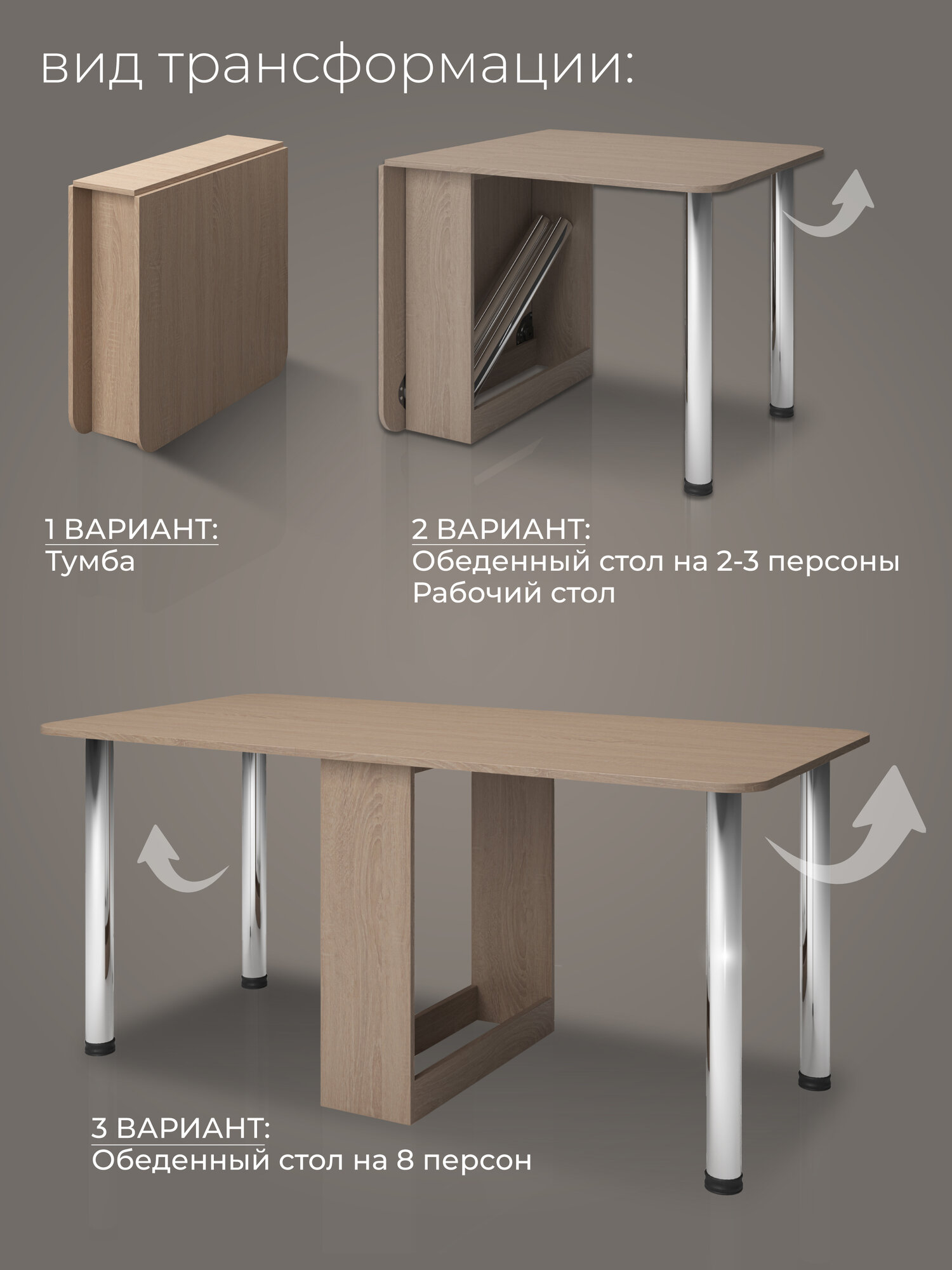 Высокая тумба оснащена двумя складными столешницами и ящиком внизу для хранения съемных металлических ножек. Модель легко трансформируется из мини столика в большой вариант. Идеально впишется в обеденную зону на кухне или в зале, а также станет функциональной подставкой для телевизора в спальне.