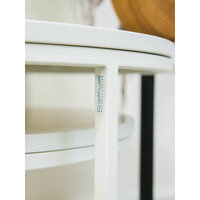 Стол выполнен в стиле лофт, что придает ему особый шарм и позволяет легко вписаться в любой интерьер. Белый мраморный цвет столешницы и основания делает его визуально легким и воздушным.