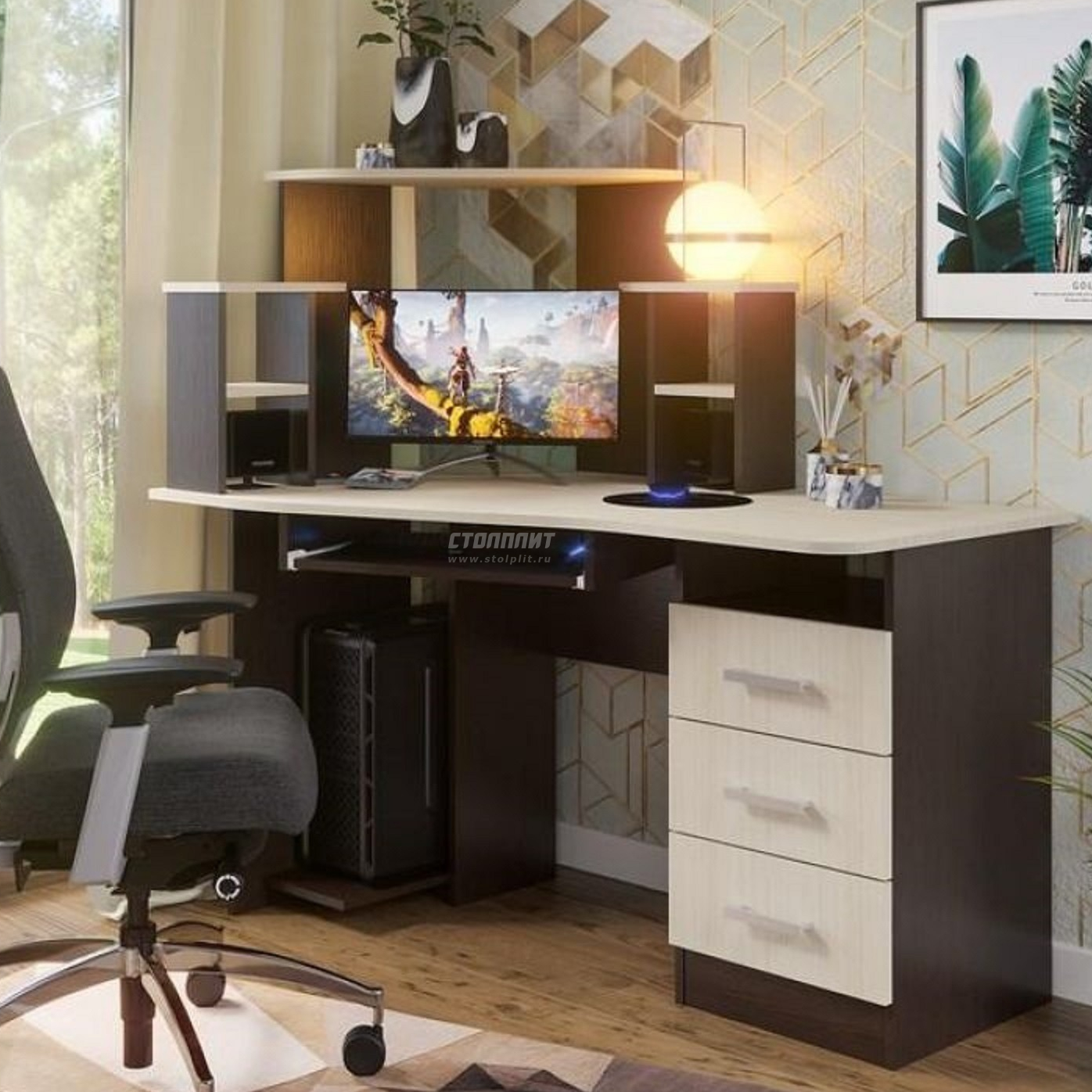 Стол оборудован удобными роликовыми направляющими, которые обеспечивают плавное и бесшумное выдвижение ящиков. Вместительное отделение для системного блока и надстройка позволяют разместить все необходимые аксессуары и документы.