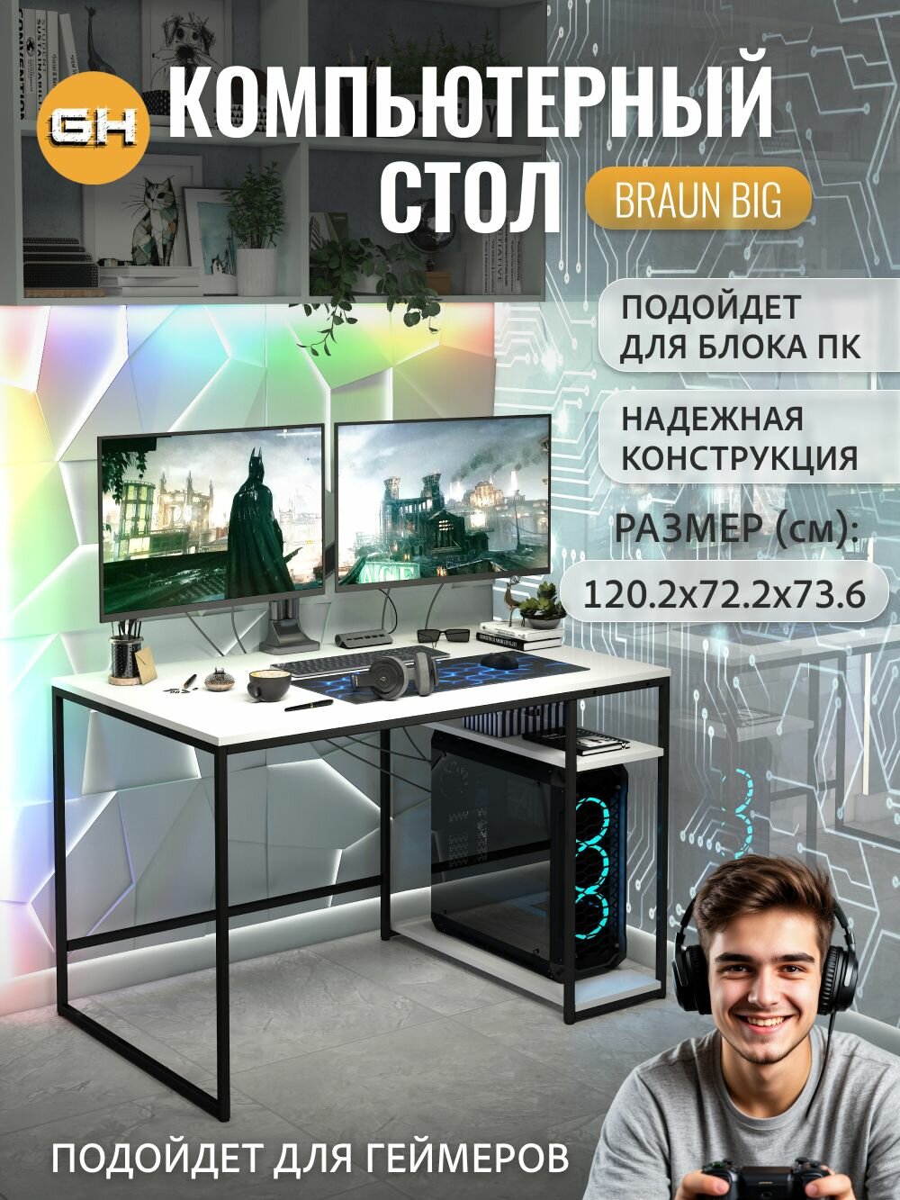 Стол компьютерный BRAUN BIG loft, белый, письменный, игровой с полками, 120×72,2×73,6 см, гростат: сравнение цен, характеристики, фото, актуальное наличие и цены.