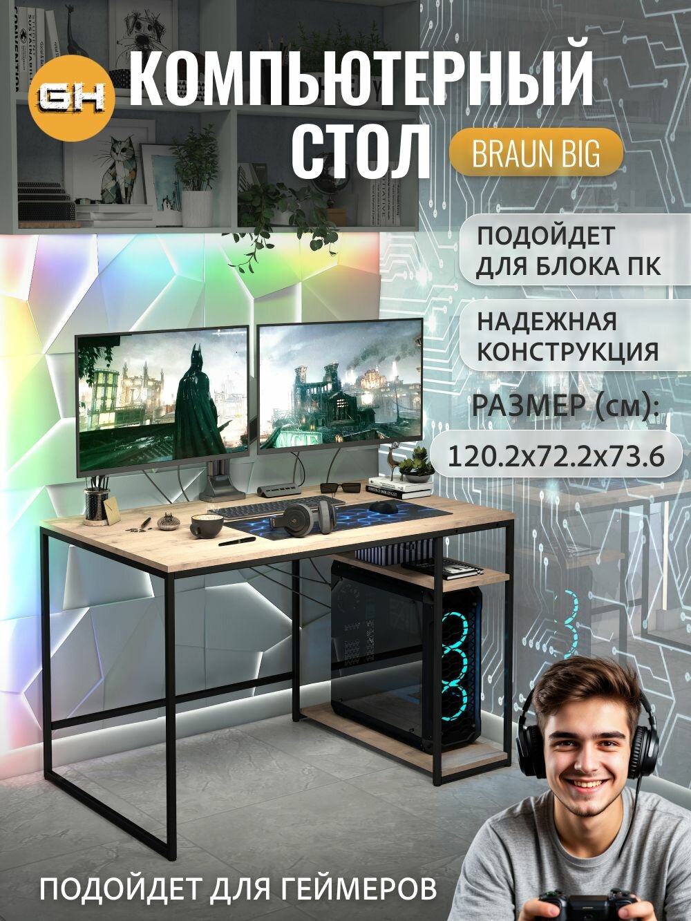 Стол компьютерный BRAUN BIG loft, дуб вотан, письменный, игровой с полками, 120×72,2×73,6 см, гростат: сравнение цен, характеристики, фото, актуальное наличие и цены.
