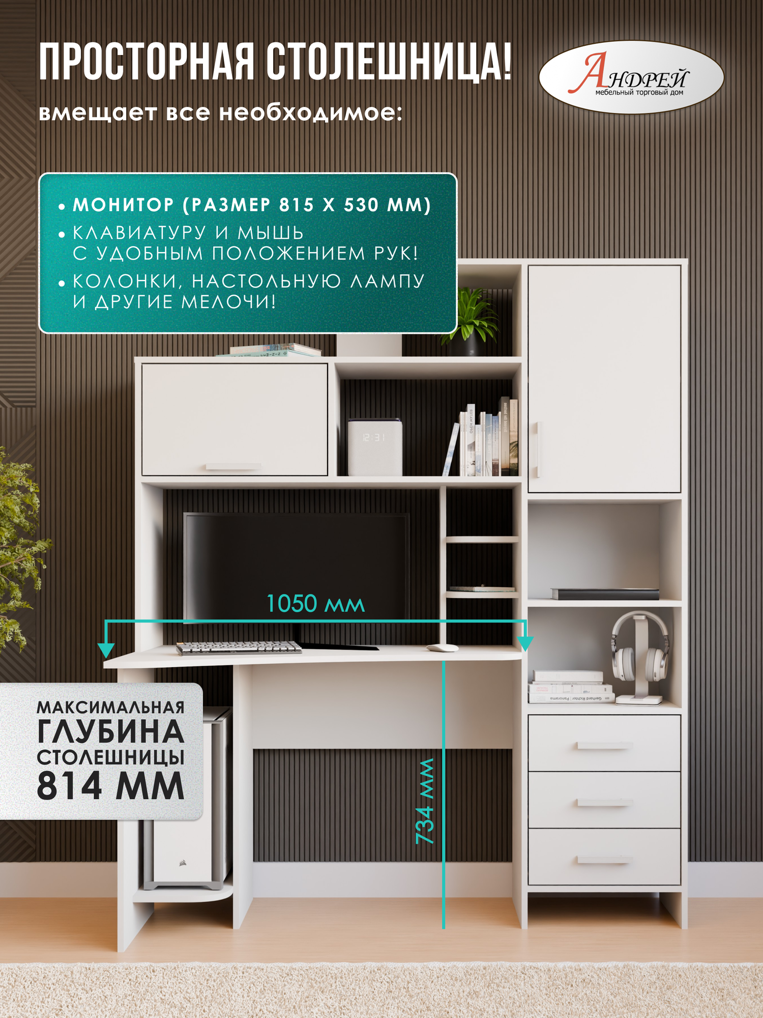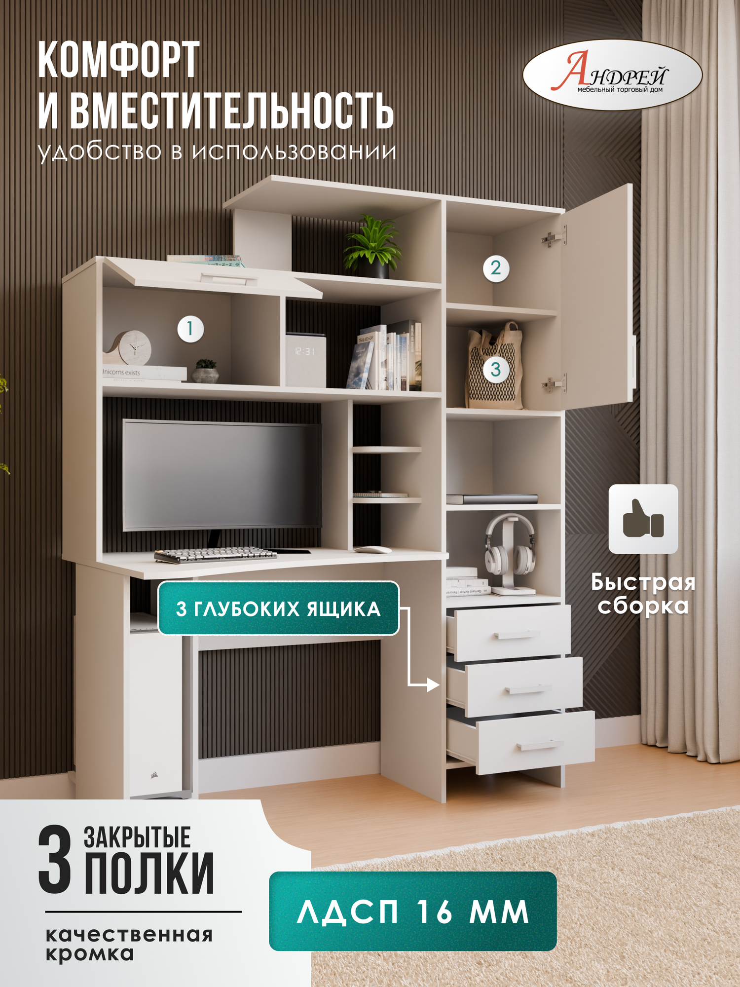 Стол компьютерный Арден- это функциональный элемент интерьера, который станет незаменимым помощником для работы. Стол выполнен из качественного ЛДСП, что обеспечивает его долговечность и надежность. Корпус и фасад стола представлены в белом цвете, что позволяет ему гармонично вписаться в любой интерьер. Стол оборудован удобной надстройкой и отделением для системного блока, что позволяет максимально эффективно использовать пространство. Также в столе предусмотрены тумба с ящиком для хранения и полка для принтера. Особенностью стола является его угловая конструкция, что позволяет сэкономить пространство в комнате. Цвет ручки С -31 (крафт темный) Стол поставляется в разобранном виде, что облегчает его транспортировку и сборку. Сборка возможна только так, как показано на фотографии. Выбирая компьютерный Арден, вы получаете не только стильный и функциональный предмет мебели, но и гарантию комфорта и удобства на долгие годы.