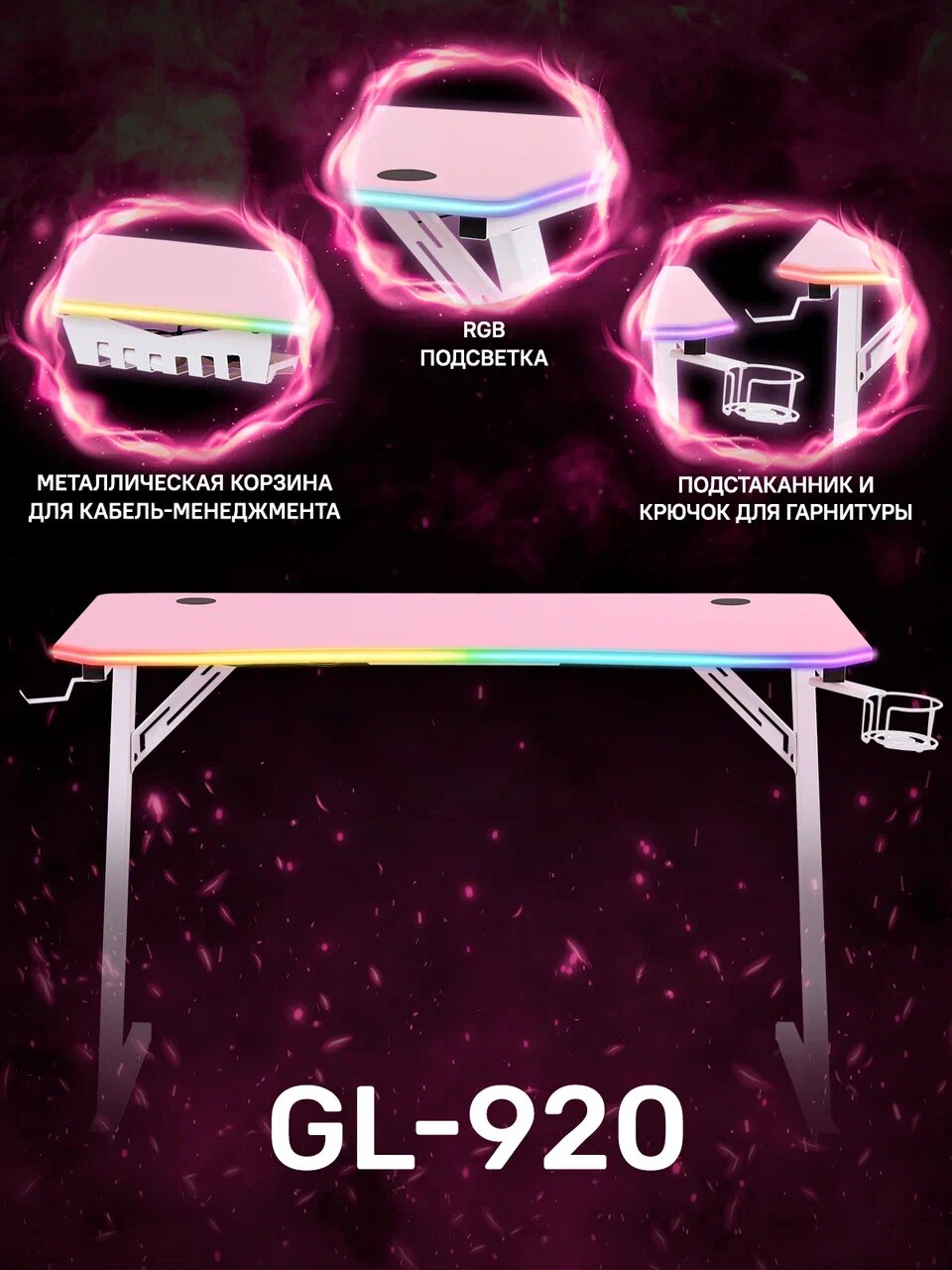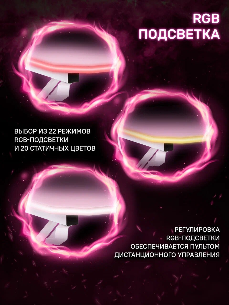 Регулировка RGB-подсветки обеспечивается пультом дистанционного управления. Наличие подстаканника и крючка для гарнитуры.