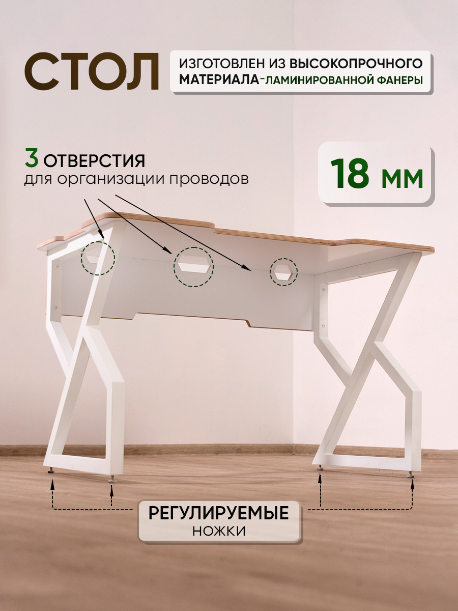 Поверхность стола изготовлена из влагостойкой ламинированной фанеры. повышенной прочности и износостойкости. Стол игровой не боится влаги, он не вздуется и не испортится от случайно пролитой воды на столе. теперь можно спокойно ставить чашечку с кофе рядом и работать)