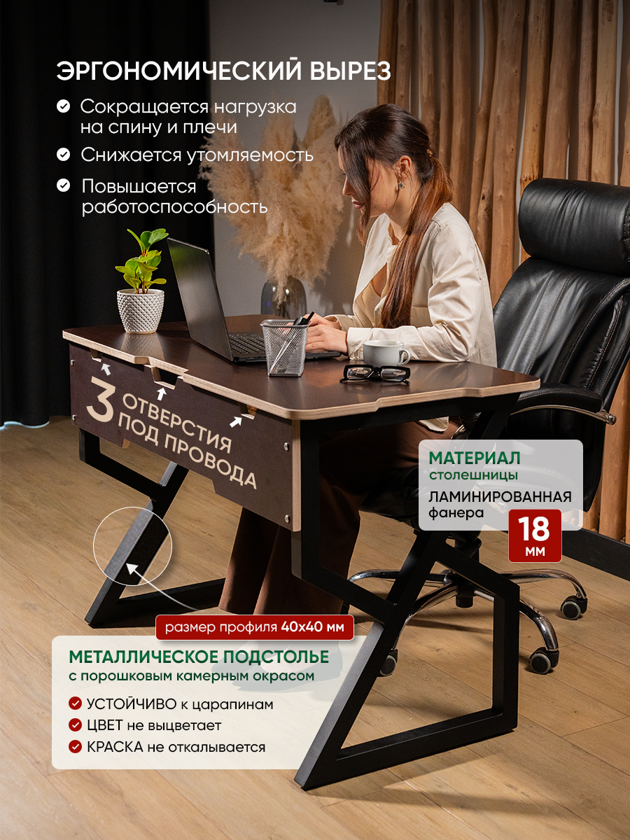 Геймерский стол имеет эргономичный вырез, выемку на столешнице, что снижает нагрузку на руки, снижает утомляемость, повышает работоспособность. Предусмотрели отверстия под кабеля - на рабочей поверхности будет порядок. Удобный, прочный и стильный темный стол школьника, рабочий стол в офис или в салон красоты как стол для мастера маникюра