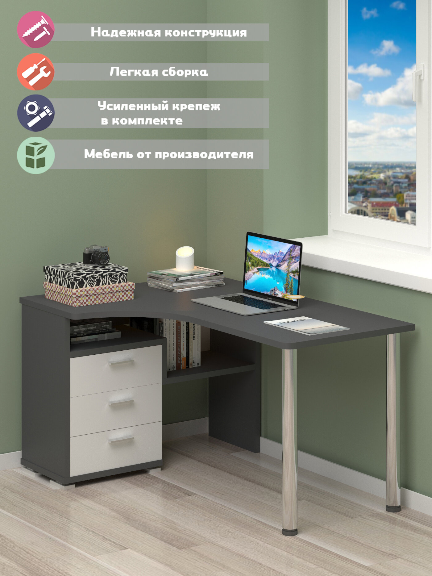 Стол компьютерный Мэрдэс СР-132С-140 ГБЕ-ЛЕВ Графит/Белый, угловой, 101 х 140 х 75 см, с ящиками: сравнение цен, характеристики, фото, актуальное наличие и цены.