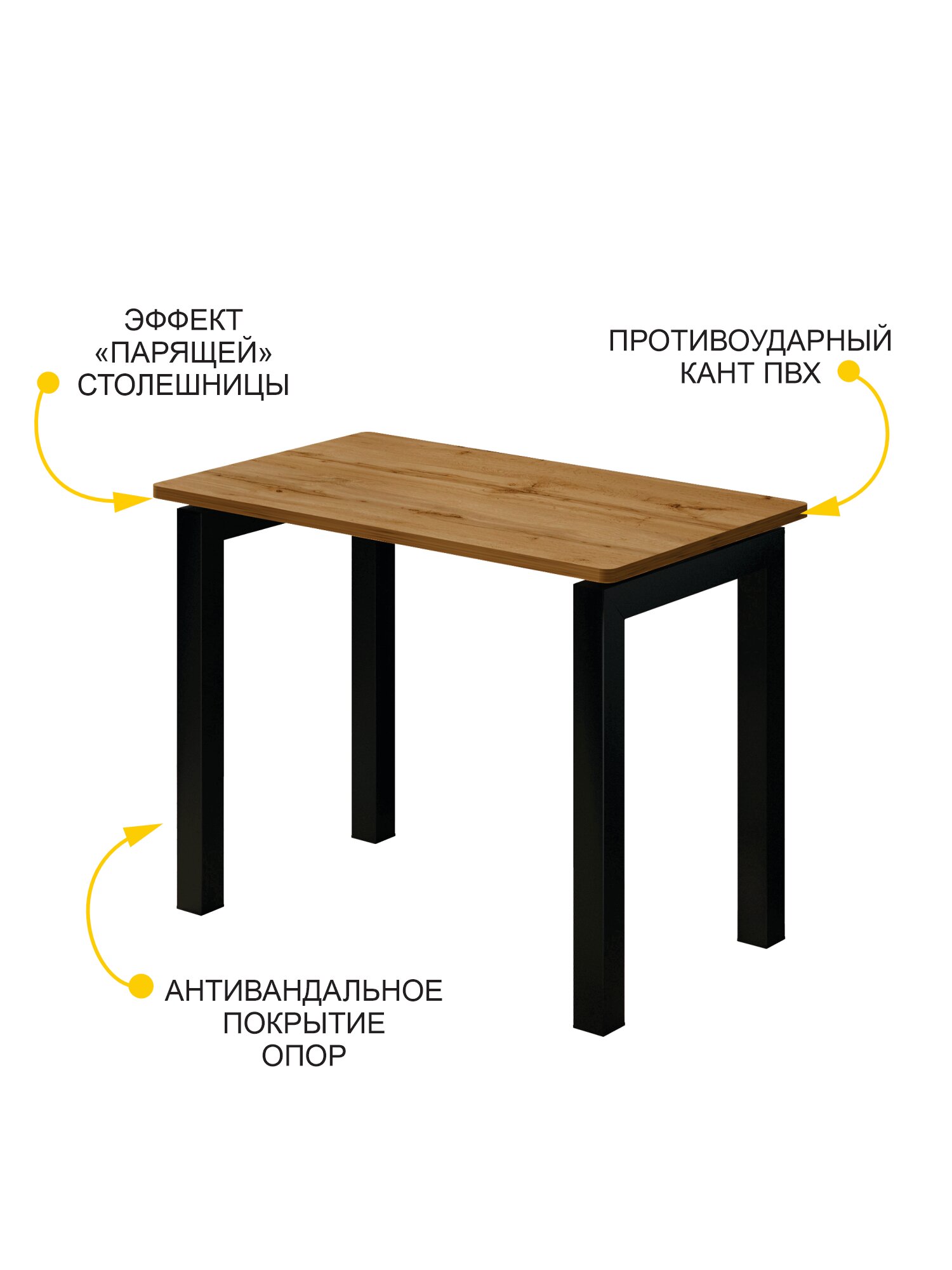 • Размер стола (ШхГхВ) – 100х60х75 см. • Эффект «парящей» столешницы создает ощущение легкости, что особенно актуально для небольших помещений. Такой дизайн отлично впишется в современный интерьер, добавит нотку элегантности и оригинальности. • Скруглённая форма столешницы исключает риск получения травм. Благодаря этому она безопасна для маленьких членов семьи. • Надежные металлические опоры обеспечивают письменному столу устойчивость, и придают стильный внешний вид. • Металлические опоры контрастного цвета подчеркивают современный дизайн компьютерного стола.