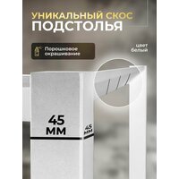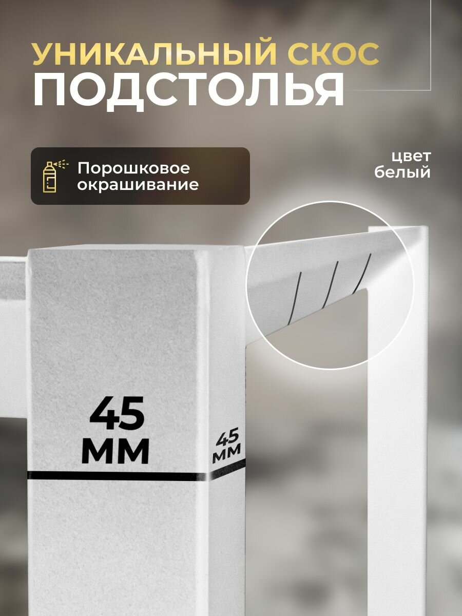 Столешница крепится на металлическую раму по всему периметру, благодаря чему конструкция стола стабильная и надежная. Подстолье окрашено в черный матовый цвет, что делает его универсальным и легко вписывающимся в любой дизайн помещения. Ножки выполнены из металлического профиля 45 мм.