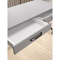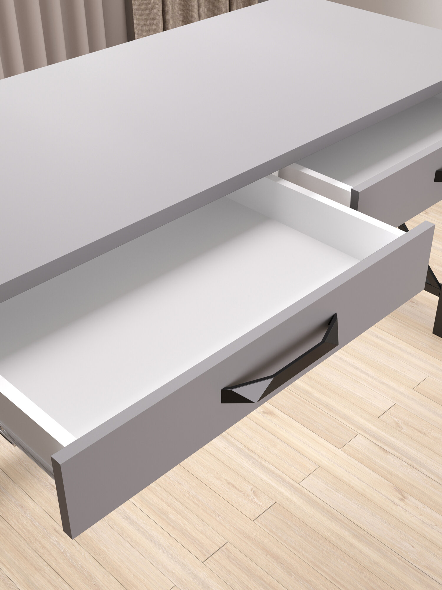 Мощный устойчивый стол Айленд. Два вместительных ящика. Стальное подстолье. Усиленная столешница 25 мм. ЛДСП премиум класса от производителя Ламарти. Цвет Вулканический серый. Столешница 140х60 см. Высота 76 см. Сочетается со стеллажами, тумбочками и другой мебелью фирмы Make Mebel