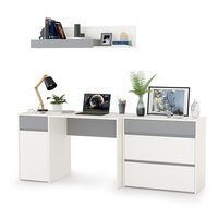 габариты (ШхГхВ) комплекта - 200х53,1х150 см, стола - 120х53,1х75,3 см, комода - 80х40,3х75,3 см, полки - 120х23,2х24 см, стол включает всестительную столешницу и тумбу под ней, тумба стола имеет удобное распашное отделение с полкой внутри и выдвижным ящиком над ним на шариковых направляющих полного выдвижения, полка расположена над столом и представляет из себя классическую открытую двухуровневую полку с задней панелью, полка позволит разместить молодёжные аксессуары - знаковые мелочи, подчёркивающие индивидуальность подростка, комод состоит из трех выдвижных ящиков на шариковых направляющих полного выдвижения, позволит хранить вещи в полном порядке, отсутствие лицевой фурнитуры и открывание фасадов за край, базовый белый цвет, сочетаясь с акцентным серым, создаёт нейтральную основу интерьера, чтобы подчеркнуть личные вещи и аксессуары, корпуса и фасады мебели изготовлены из ЛДСП 16 мм, торцы окромлены ПХВ плёнкой 0,4 мм, поставляется в разобранном виде