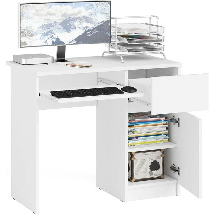 - Аккуратный стол компьютерный с тумбой и выдвижной панелью для клавиатуры. Тумба имеет нишу с полочкой за распашной дверкой и выдвижной ящик на роликовых направляющих. Стол компьютерный Мори МС-1 правый не имеет универсальной сборки - выдвижной ящик расположен справа.