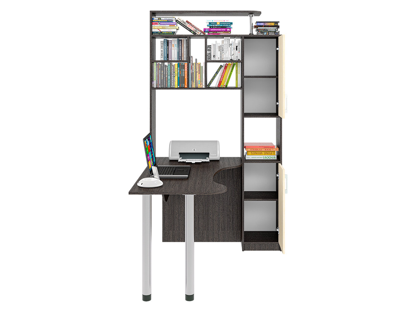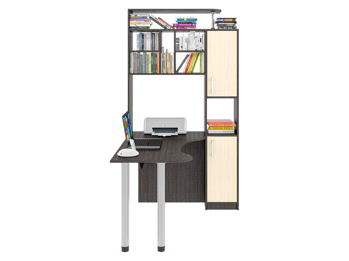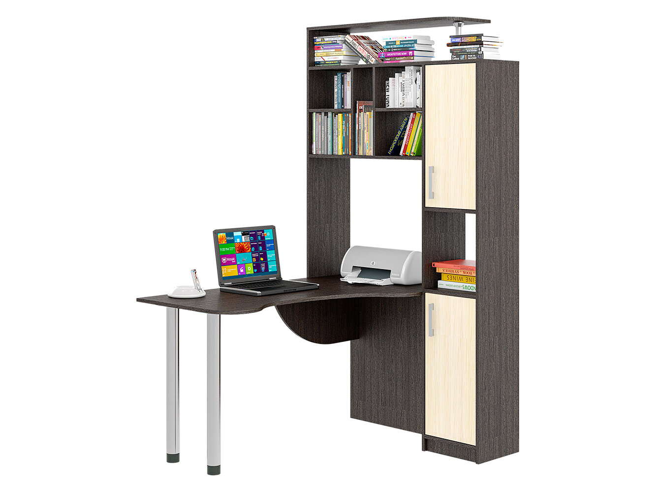 Стол компьютерный угловой СК-14 удобный и вместительный. Помимо привычных столешницы и полок, здесь присутствует пенал с распашными дверцами. Его визуально разделяет на две части открытая ниша. Также стол имеет надстройку, образующую удобную конструкцию с множеством открытых полок и места для CD-дисков. На крыше надстройки можно разместить акустическую систему или дополнительную технику, документы и сувениры. Если говорить об основном элементе, столешнице, то она имеет фигурную форму, благодаря чему рабочее пространство является большим и удобным. Столешница с одной стороны опирается на две металлические регулируемые по высоте ножки цвета хром. Эти элементы делают конструкцию современной и эстетически привлекательной. Данная модель стола будет интересна как для дома, так и для офиса. Теперь этот стол можно собрать как левым, так и правым ( универсальная сборка )