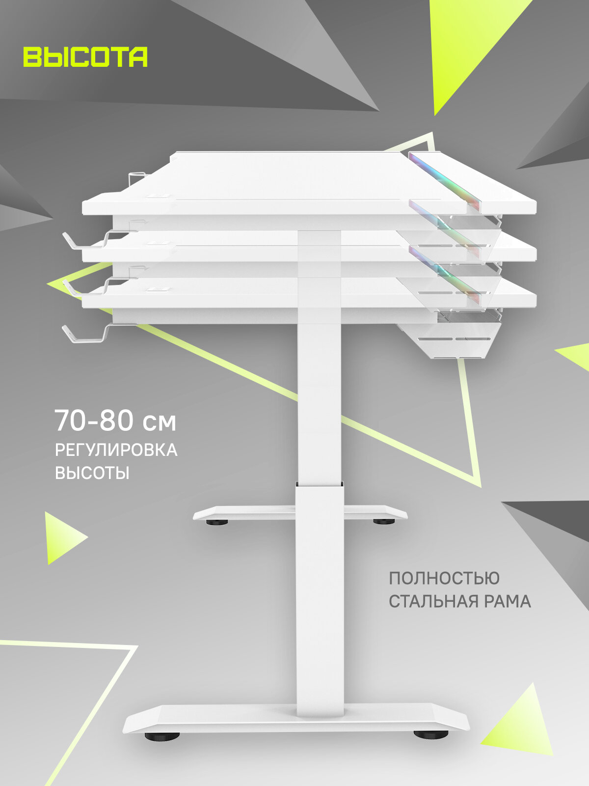 RGB подсветка столешницы добавляет эстетики и позволяет создать уникальную атмосферу в комнате. Функциональная панель управления позволяет легко и быстро регулировать настройки стола. Регулировка высоты столешницы (70/75/80 см) позволяет адаптировать стол под индивидуальные предпочтения и нужды пользователя.