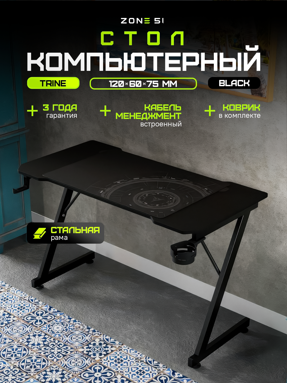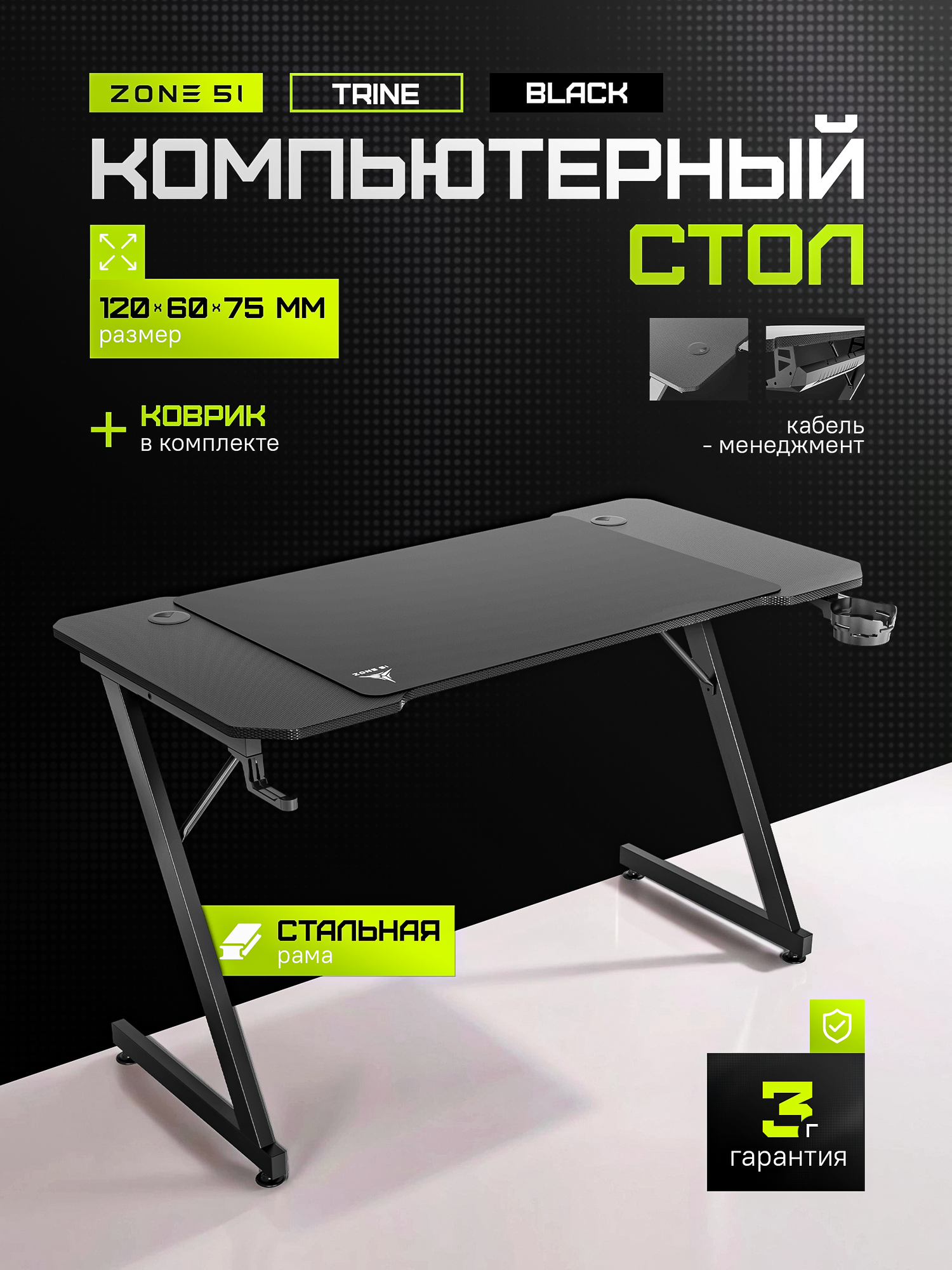Купить Игровой компьютерный стол ZONE 51 TRINE 120, Black, черный, с кабель-каналами с доставкой по всей России.
