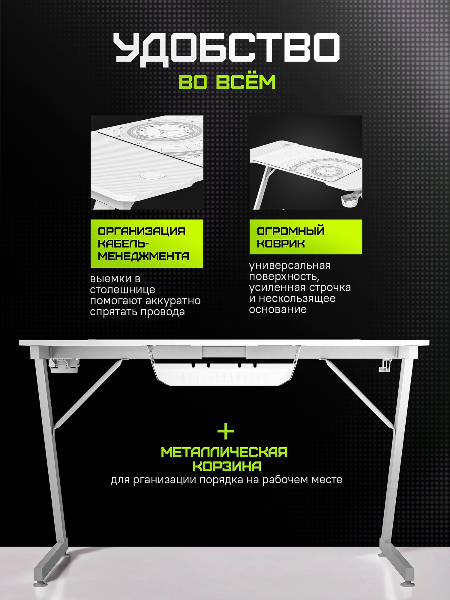 Также стоит отметить наличие двух выемок и корзины под столешницей, что обеспечивает удобный кабель-менеджмент. Это позволяет аккуратно и без лишних проводов организовать рабочее пространство.