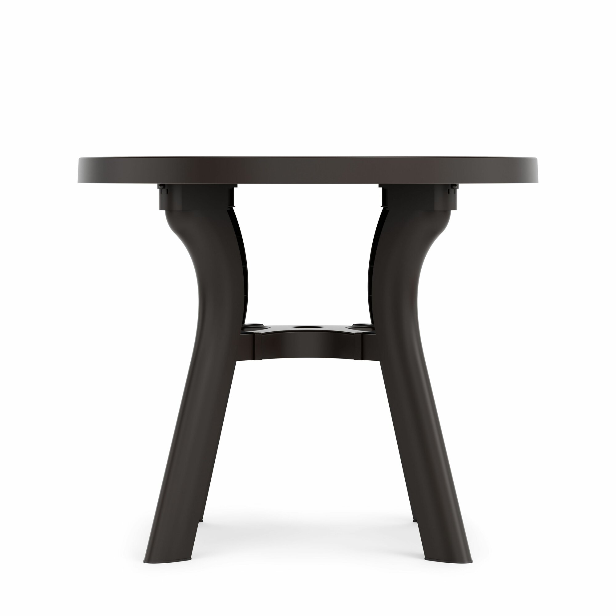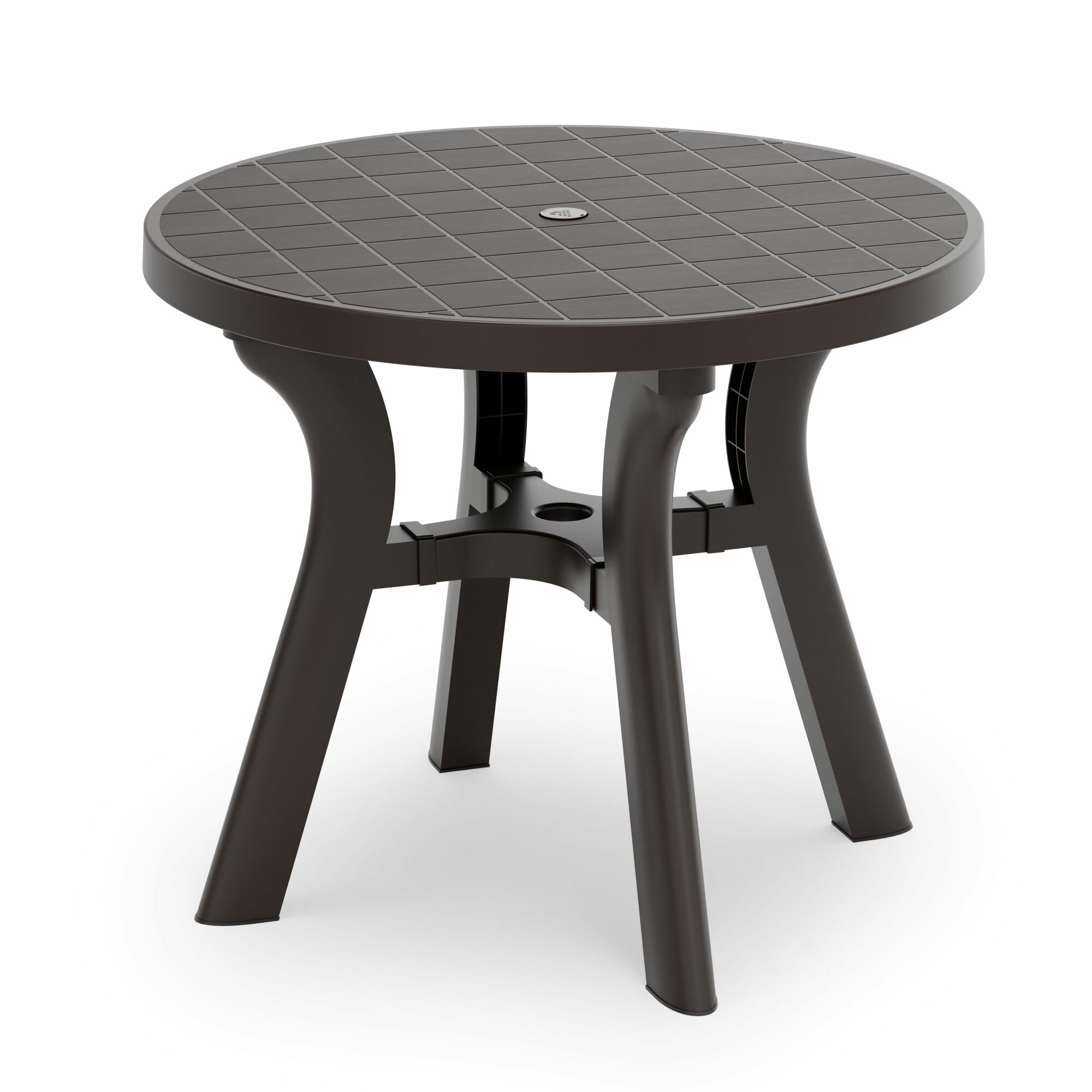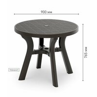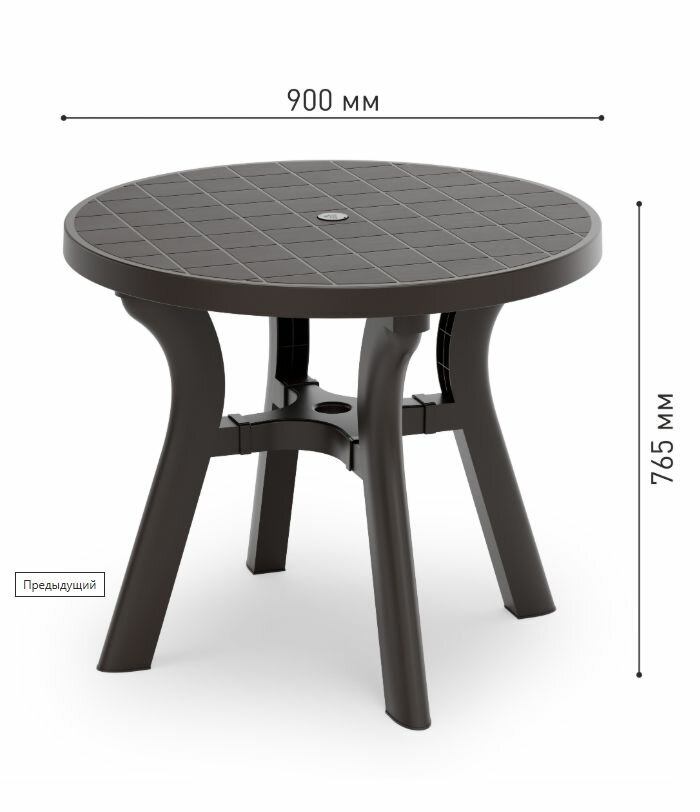 Стол "Атлант" с круглой столешницей имеет прочную конструкцию и устойчивый каркас, выдерживает воздействие внешних факторов, не теряя своего первоначального облика и качества. Изогнутые ножки соединены между собой крестовиной, что придает столу особую устойчивость. Ножки регулируются по высоте. Конструкция полностью разборная, что облегчает транспортировку и складирование. В центре столешницы имеется отверстие с заглушкой для установки зонта. Особенность данного стола в текстуре столешницы, которая эмитирует дерево.