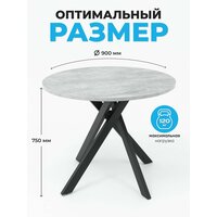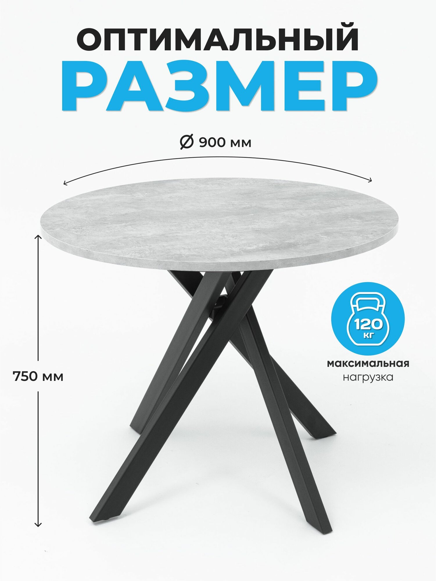 Диаметр стола 90 см и имеет достаточно места для размещения посуды и других предметов. Высота стола составляет 75 см, для комфортного использования. Толщина столешницы 22 мм.