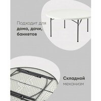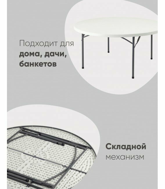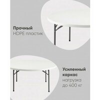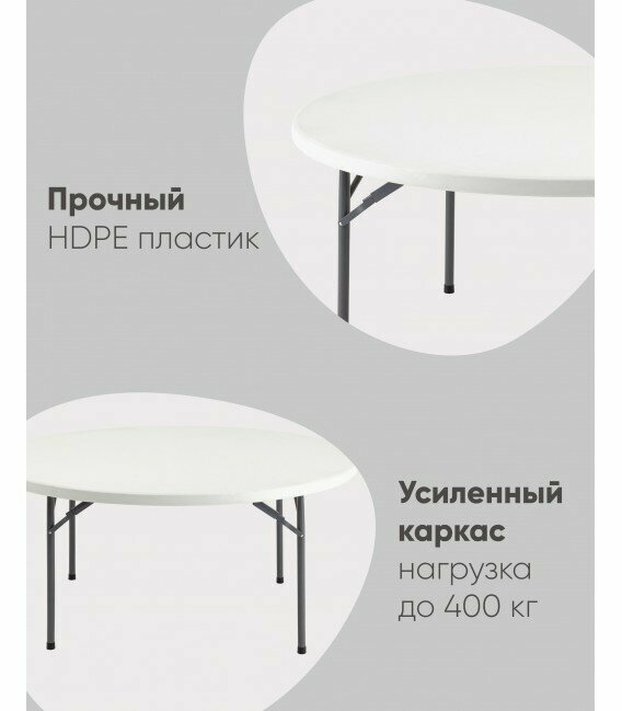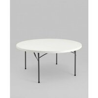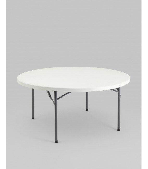 Стол круглый, 160*74 см. Для каркаса используется стальная труба особой прочности 32*1 мм, а столешница, толщиной 5 см, выполнена из 100% не переработанного полиэтилена HDPE (полиэтилен высокой плотности). Считается одним из более безопасных видов пластика. HDPE пластик выдерживает высокие нагрузки, не трескается при ударной нагрузке, эластичен в диапазоне температур от –70 до +100 °С.