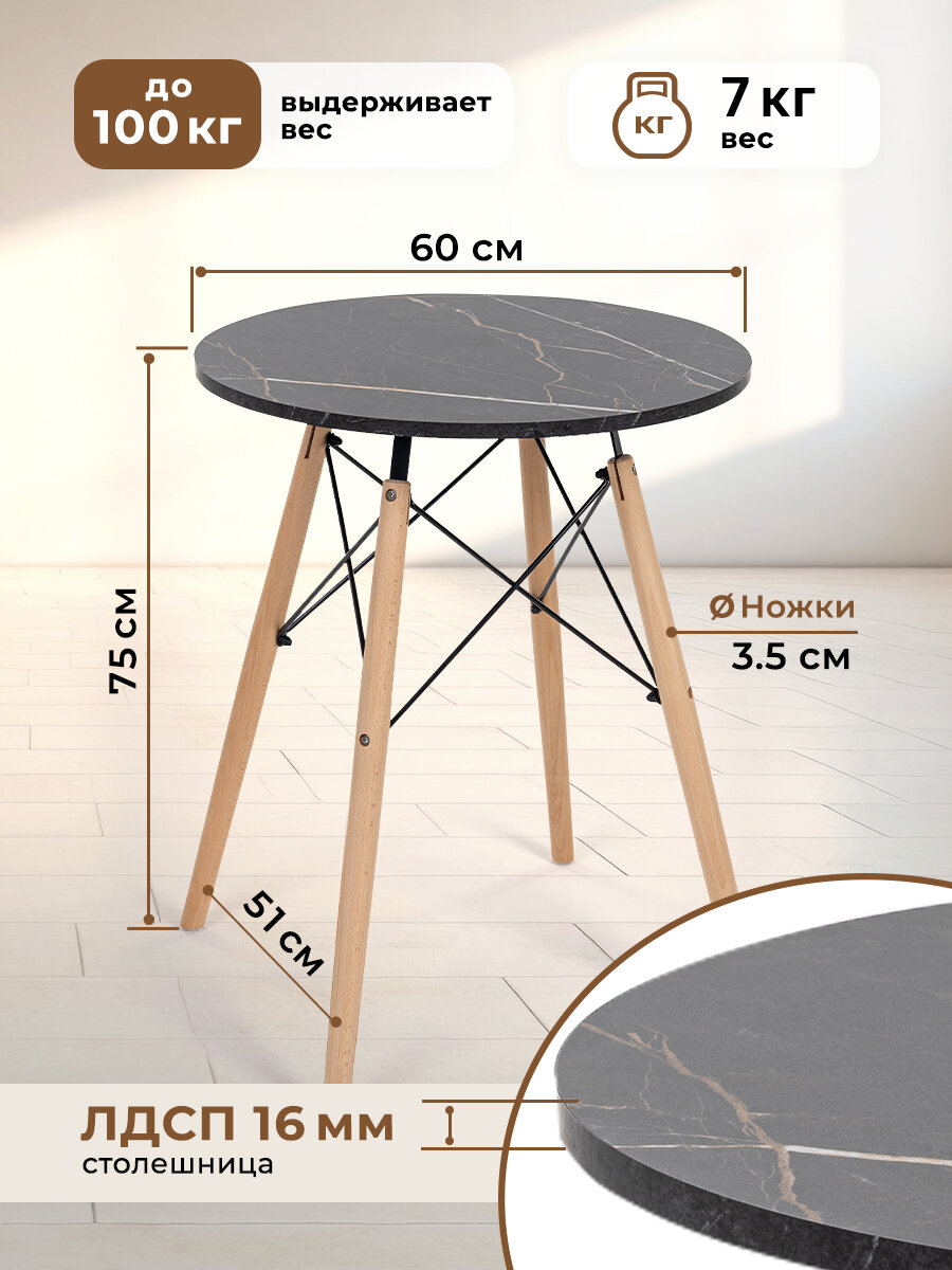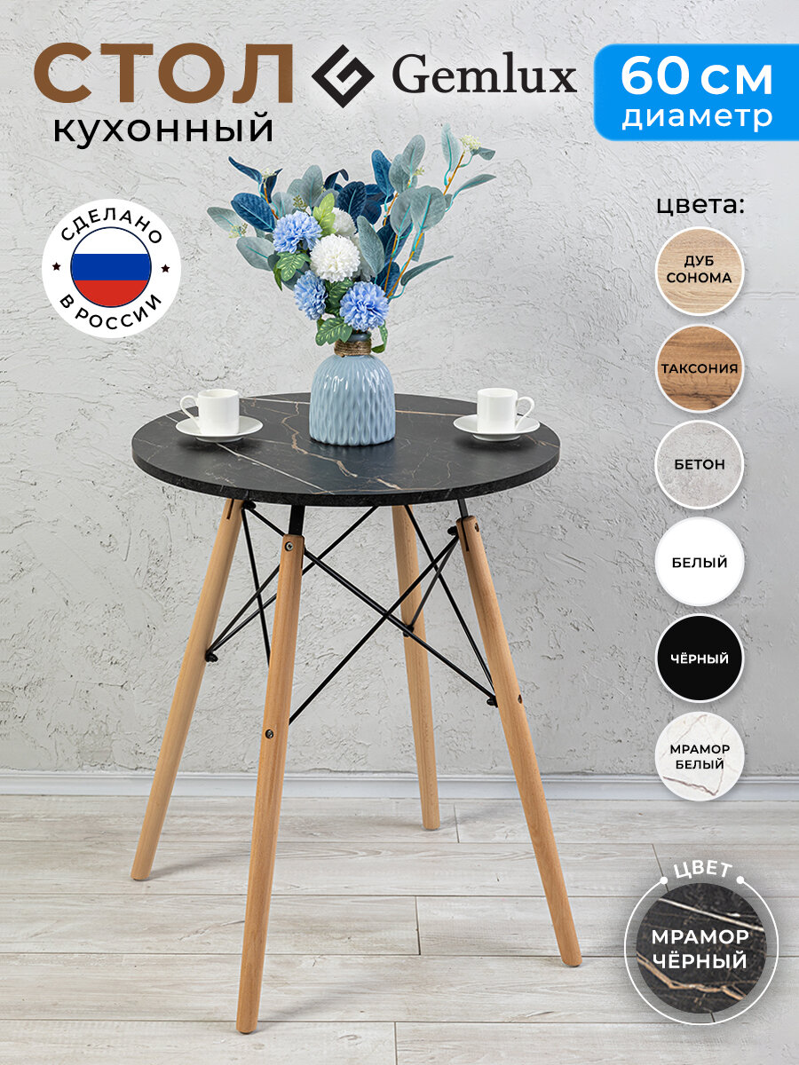 Стол, как правило, представляет собой основной элемент интерьера, который занимает центральное место в комнате. Поэтому важны не только его удобство и функциональность, но и красота, и попадание в стиль. Представляем вам круглый кухонный и обеденный стол Gemlux в скандинавском стиле. Это современная мебель для дома, дачи и сада со столешницей из ЛДСП и изящным подстольем из дерева и металла. Лаконичная форма и простой, но элегантный дизайн гарантируют, что наши столы органично впишутся в интерьер в стиле сканди, минимализм, лофт или модерн и станут украшением вашей кухни, гостиной и столовой, балкона и лоджии. Универсальный предмет мебели также может послужить в качестве удобного рабочего, письменного и компьютерного стола, столика для ПК и ноутбука. Используйте его как школьный и учебный стол, мебель для ребенка в детскую, для школьника и подростка, девочки и мальчика. Он подойдет вам в качестве декоративного чайного и кофейного, сервировочного и журнального мини столика, высокого туалетного столика для косметики в спальне, стола в комнату отдыха для бани и сауны, дачной и садовой мебели для пикника, шашлыков и барбекю. Прочный стол с деревянной столешницей и металлическим каркасом - это идеальное решение для кафе и ресторана, зоны отдыха или клиентской зоны в офисе или салоне красоты.