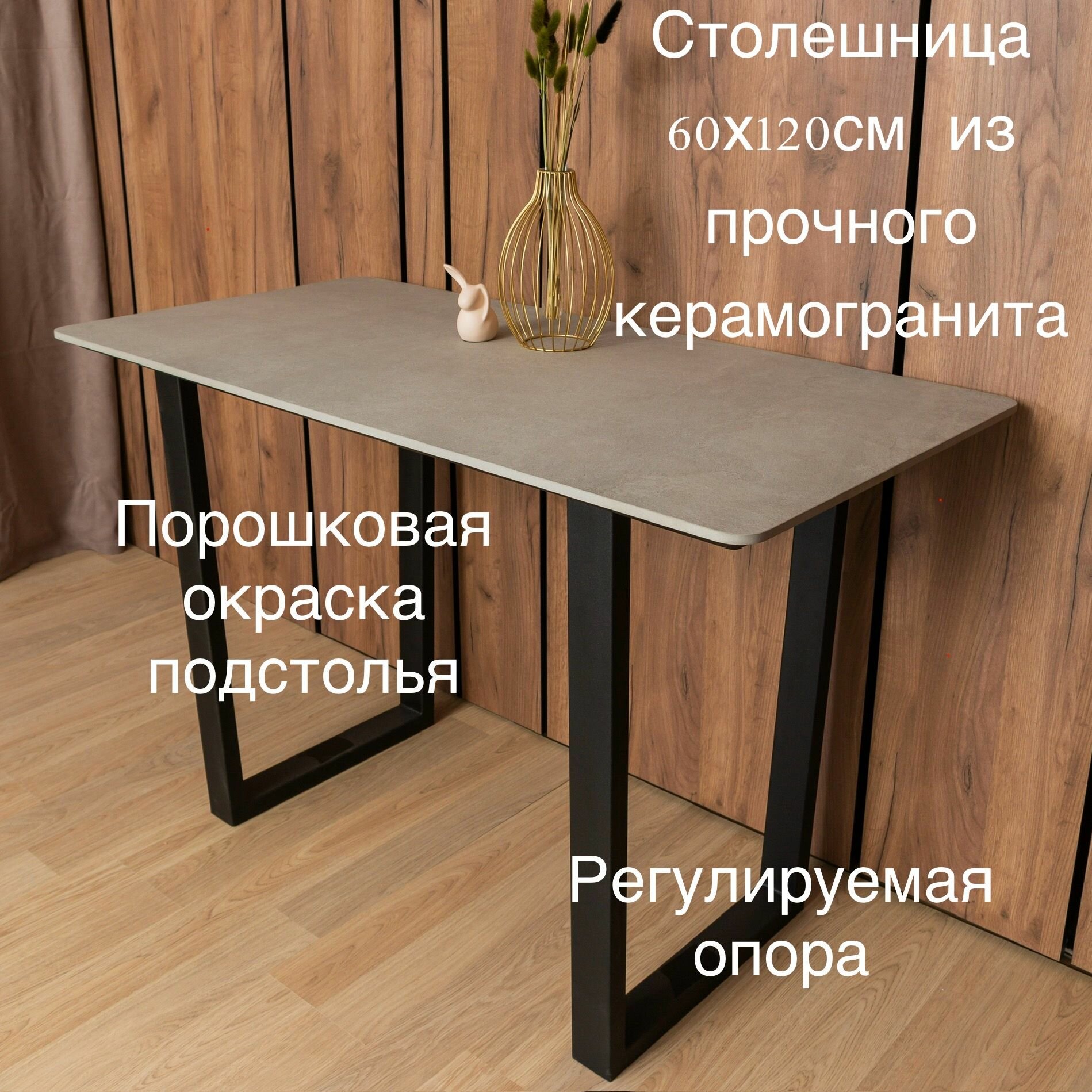Столешница стола изготовлена из прочного керамогранита толщиной 8-10 мм, что обеспечивает долговечность и устойчивость к повреждениям. Прямоугольная форма столешницы размером 120 см x 60 см позволяет разместить за столом достаточное количество людей.
