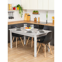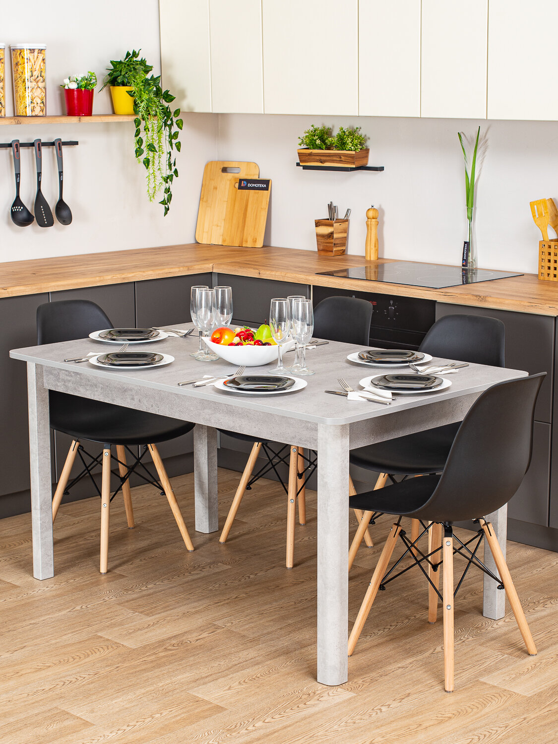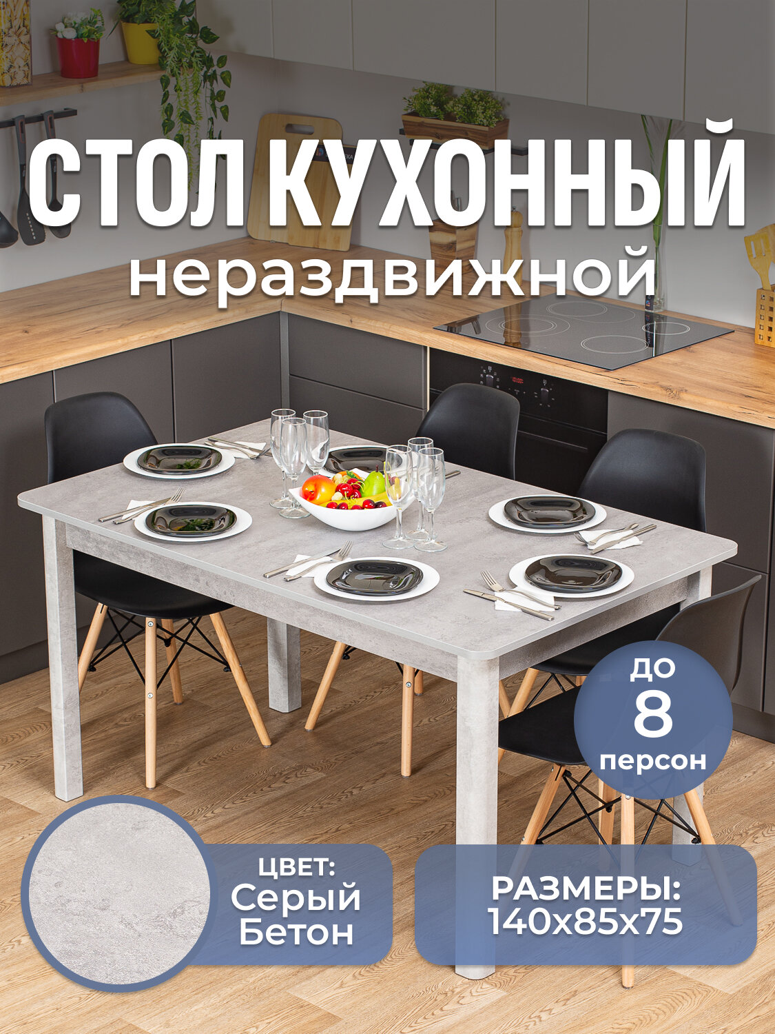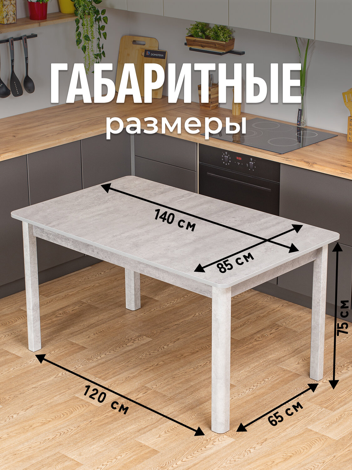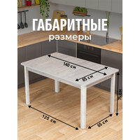 Кухонный стол имеет прямоугольную столешницу размером 140 на 85 сантиметров из ЛДСП, которая выдерживает значительную нагрузку и прослужит много лет. Ножки имеют скругление и изготовлены из МДФ, что делает стол легким, но при этом устойчивым и прочным.