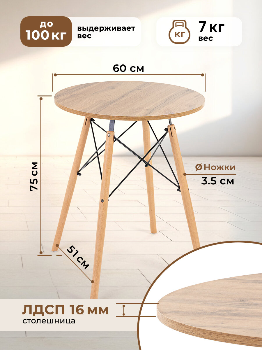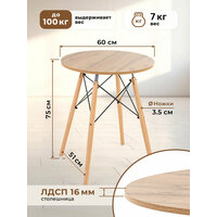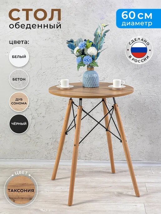 Стол, как правило, представляет собой основной элемент интерьера, который занимает центральное место в комнате. Поэтому важны не только его удобство и функциональность, но и красота, и попадание в стиль. Представляем вам круглый кухонный и обеденный стол Gemlux в скандинавском стиле. Это современная мебель для дома, дачи и сада со столешницей из ЛДСП и изящным подстольем из дерева и металла. Лаконичная форма и простой, но элегантный дизайн гарантируют, что наши столы органично впишутся в интерьер в стиле сканди, минимализм, лофт или модерн и станут украшением вашей кухни, гостиной и столовой, балкона и лоджии. Универсальный предмет мебели также может послужить в качестве удобного рабочего, письменного и компьютерного стола, столика для ПК и ноутбука. Используйте его как школьный и учебный стол, мебель для ребенка в детскую, для школьника и подростка, девочки и мальчика. Он подойдет вам в качестве декоративного чайного и кофейного, сервировочного и журнального мини столика, высокого туалетного столика для косметики в спальне, стола в комнату отдыха для бани и сауны, дачной и садовой мебели для пикника, шашлыков и барбекю. Прочный стол с деревянной столешницей и металлическим каркасом - это идеальное решение для кафе и ресторана, зоны отдыха или клиентской зоны в офисе или салоне красоты.