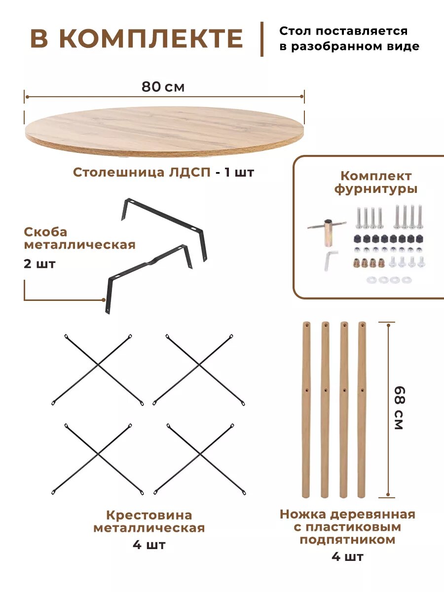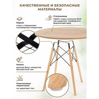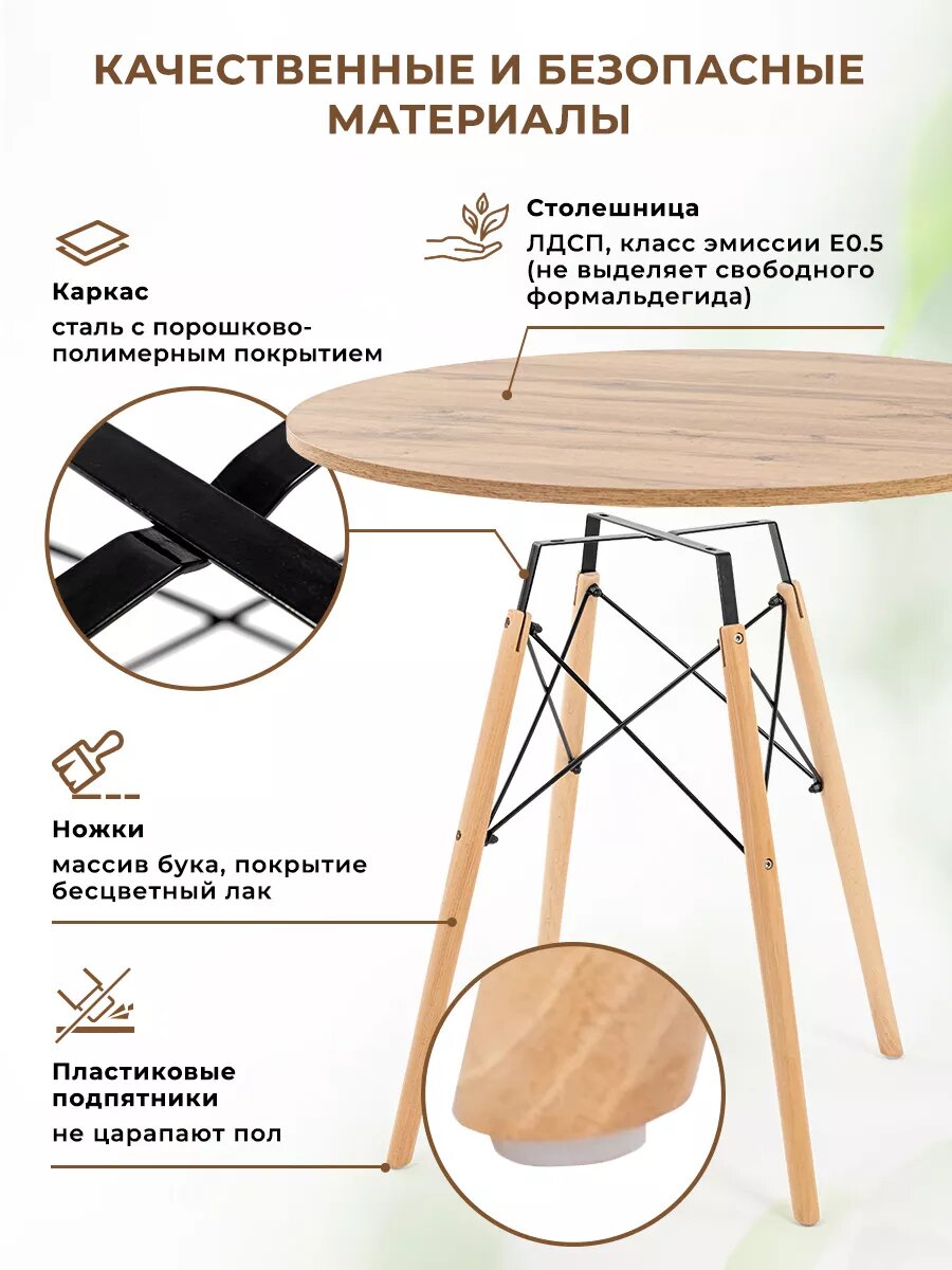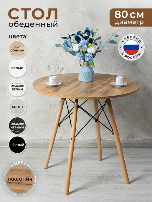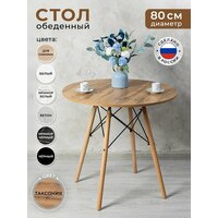 Стол, как правило, представляет собой основной элемент интерьера, который занимает центральное место в комнате. Поэтому важны не только его удобство и функциональность, но и красота, и попадание в стиль. Представляем вам круглый кухонный и обеденный стол Gemlux в скандинавском стиле. Это современная мебель для дома, дачи и сада со столешницей из ЛДСП и изящным подстольем из дерева и металла. Лаконичная форма и простой, но элегантный дизайн гарантируют, что наши столы органично впишутся в интерьер в стиле сканди, минимализм, лофт или модерн и станут украшением вашей кухни, гостиной и столовой, балкона и лоджии. Универсальный предмет мебели также может послужить в качестве удобного рабочего, письменного и компьютерного стола, столика для ПК и ноутбука. Используйте его как школьный и учебный стол, мебель для ребенка в детскую, для школьника и подростка, девочки и мальчика. Он подойдет вам в качестве декоративного чайного и кофейного, сервировочного и журнального мини столика, высокого туалетного столика для косметики в спальне, стола в комнату отдыха для бани и сауны, дачной и садовой мебели для пикника, шашлыков и барбекю. Прочный стол с деревянной столешницей и металлическим каркасом - это идеальное решение для кафе и ресторана, зоны отдыха или клиентской зоны в офисе или салоне красоты.