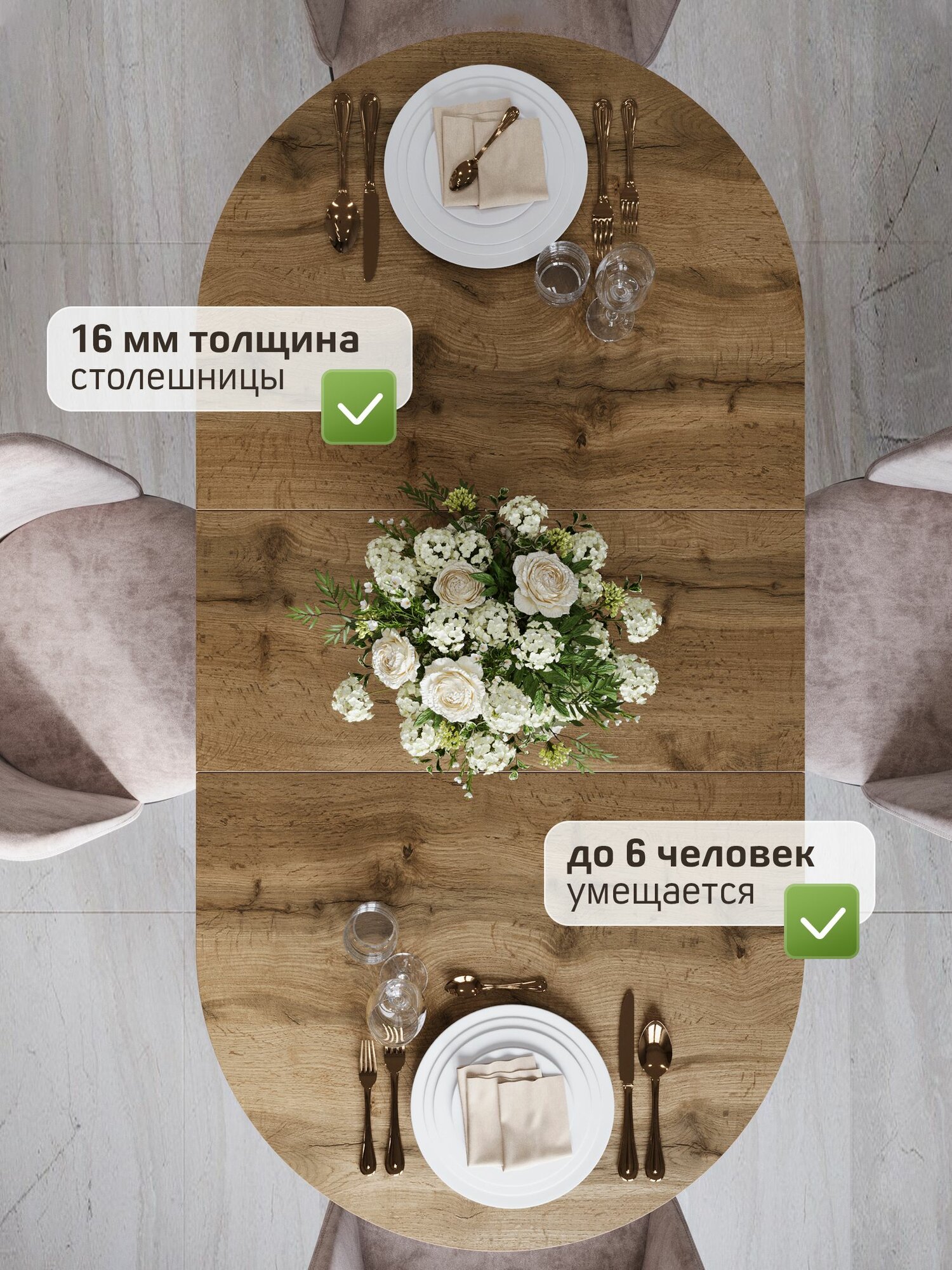 Стол обеденный «Овальный» идеально подойдет к любой кухне. Благодаря надежному раздвижному механизму можно быстро и просто увеличить размер столешницы. В разложенном виде за столом с комфортом могут разместиться до восьми человек.