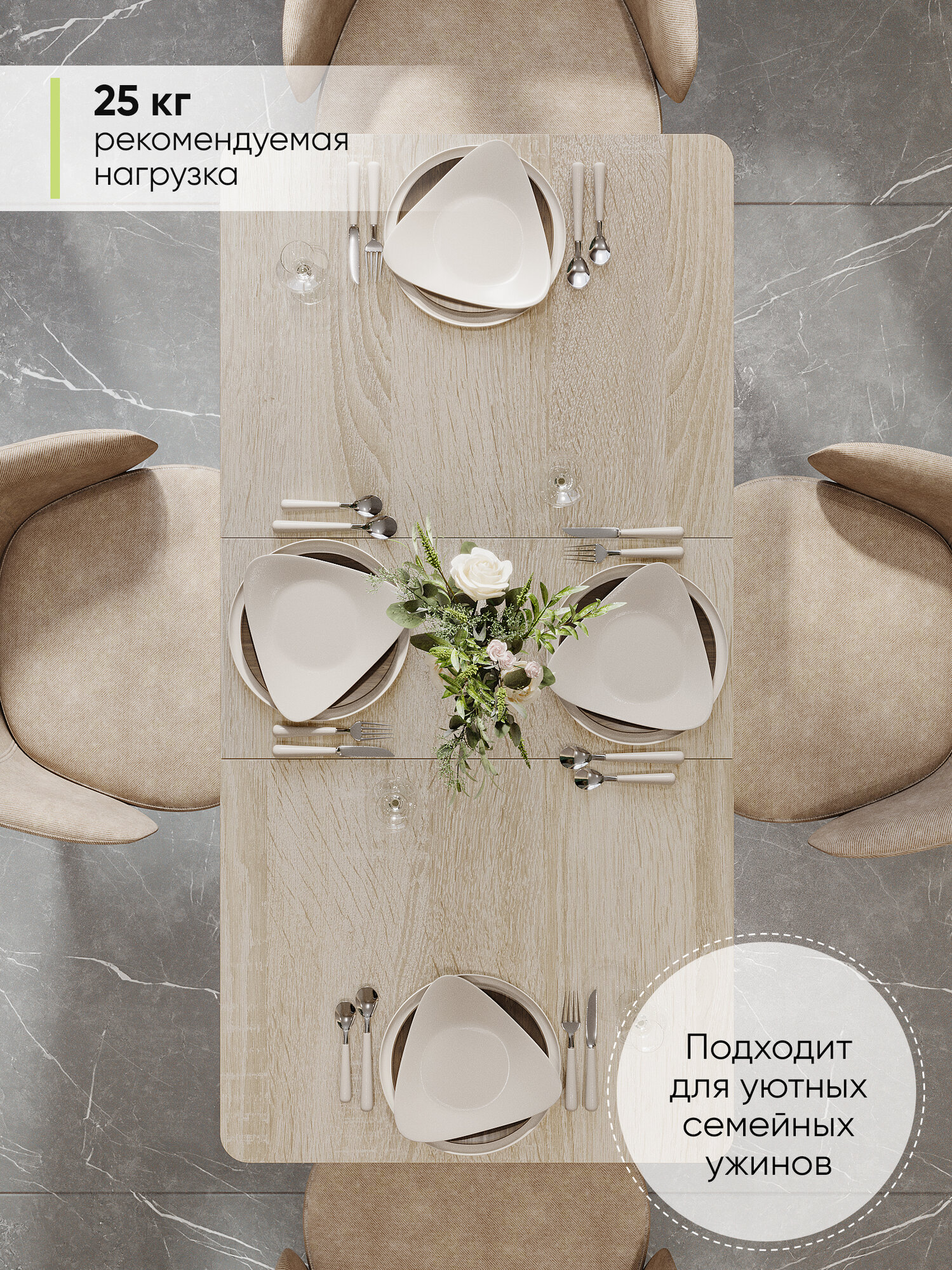 Столешница и каркас изготовлены из фактурного ЛДСП в различных цветовых решениях. Заводская надёжная упаковка из крепкого, плотного 5-и слойного картона поможет добраться столу до Вас в целости и невредимости. Действует гарантия на мебель и кухонные раскладные столы от производителя 12 мес.