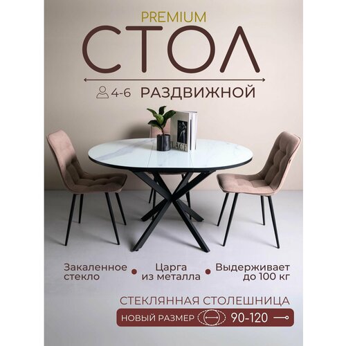 Стол кухонный раздвижной обеденный круглый диаметром 90 см, выполненную из стекла с эффектом белого императорского мрамора Calacatta Vagli. Стильный и функциональный раскладной кухонный стол дорогой дизайнерский идеально впишется в любой интерьер. Стеклянная поверхность устойчива к пятнам и легко очищается, что делает его идеальным для повседневного использования на кухне. Овальный стол прекрасен в гостиной или столовой.