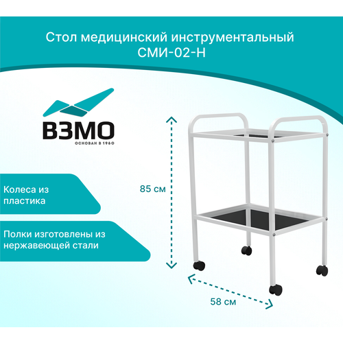 Стол медицинский инструментальный СМИ-02-С предназначен для размещения инструмента, лекарственных препаратов и приборов. Каркас выполнен из профильной стальной трубы 20х20. Столик стандартно комплектуется пластиковыми колесами диаметром не менее 50 мм, два из которых с тормозом. Полки: нержавеющая сталь. Изделие поставляется в разобранном виде.