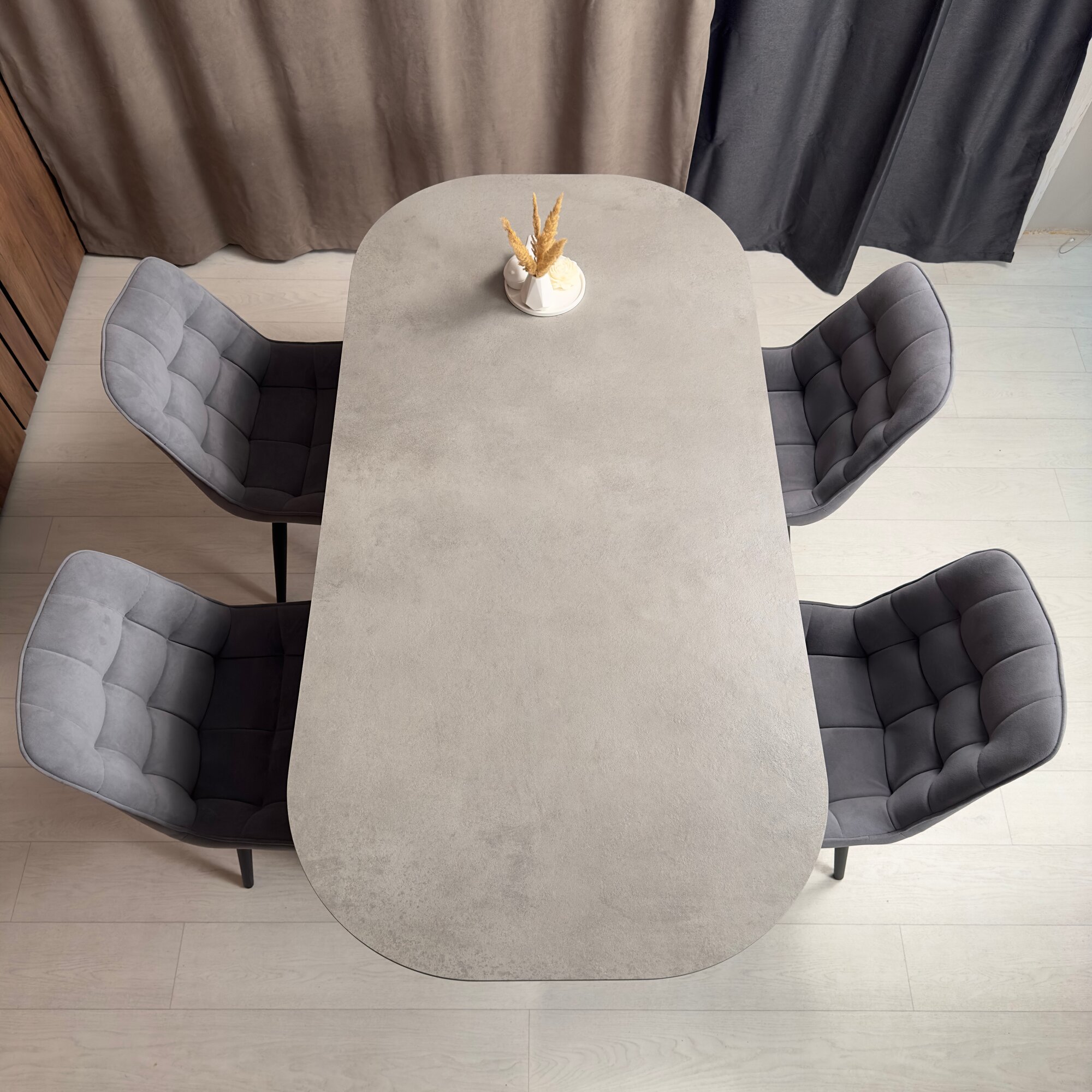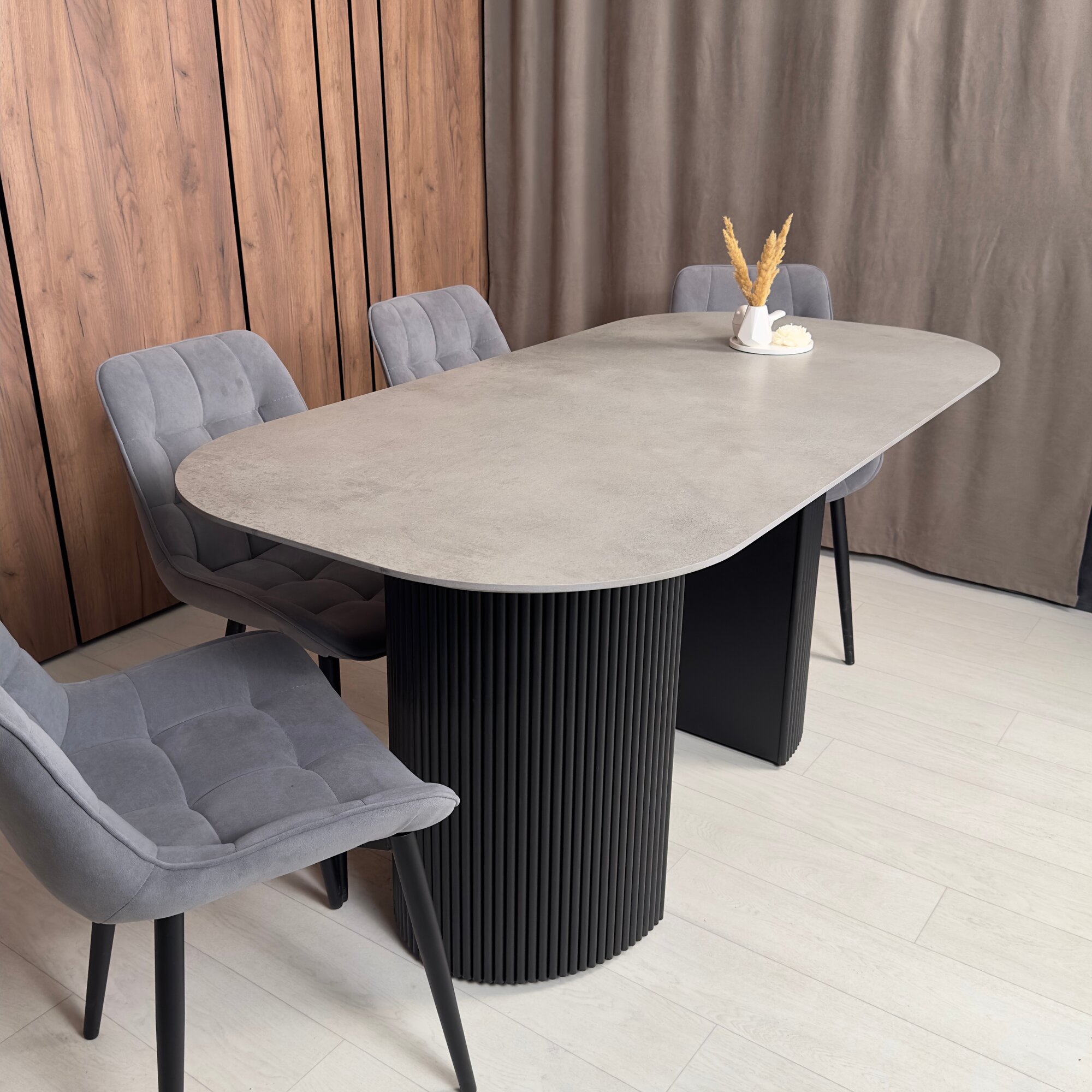 Стол выполнен из керамогранита серого цвета, что придает ему элегантный и современный вид. Керамогранит - это материал, который отличается высокой прочностью и долговечностью, что делает его отличным выбором для кухни или бара.