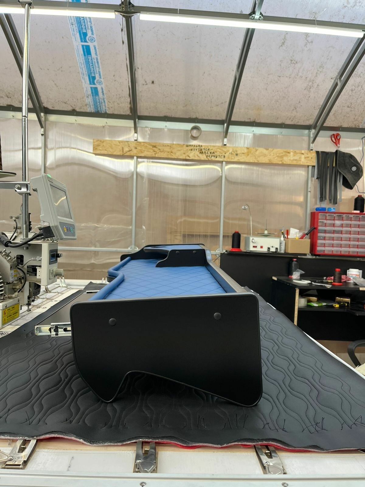 Стол на торпедо для Mаз Евро с подстаканником Синяя экокожа Синий ромб