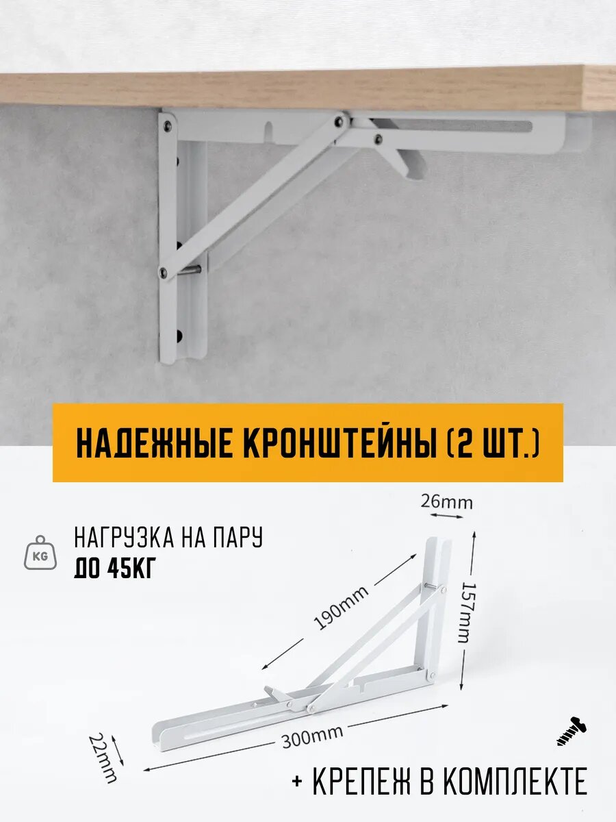 Кронштейны из металла выдерживают нагрузку до 45кг и обеспечивают долговечность конструкции, а столешница из ЛДСП легко чистится и подходит для повседневного использования.