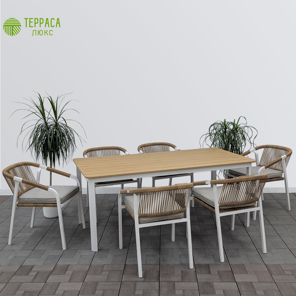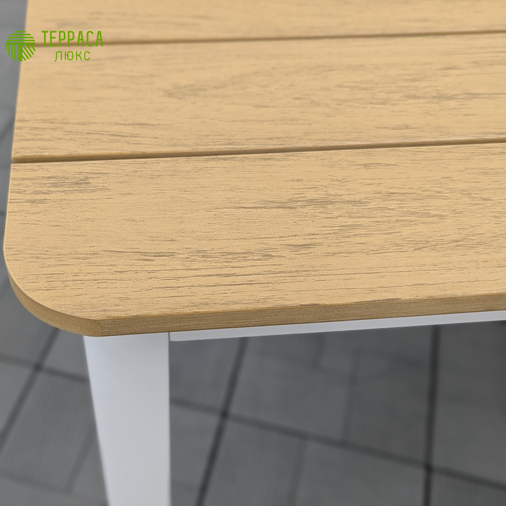 Столешница толщиной 3 см и весом 27 кг выполнена в белом цвете, что придает столу нарядный и современный вид. Бежевый оттенок доски ДПК гармонично сочетается с белым подстольем, создавая стильный и гармоничный образ.