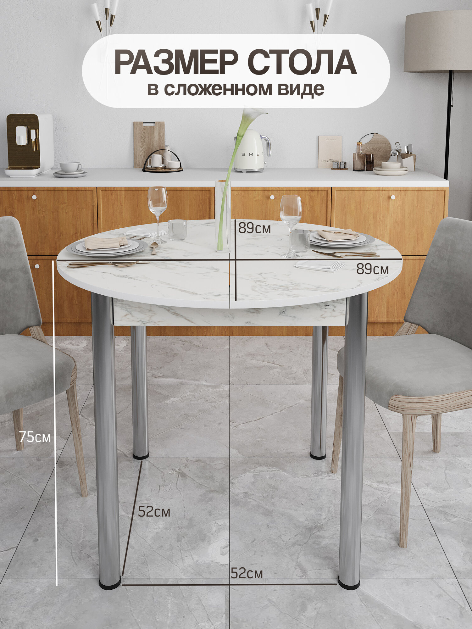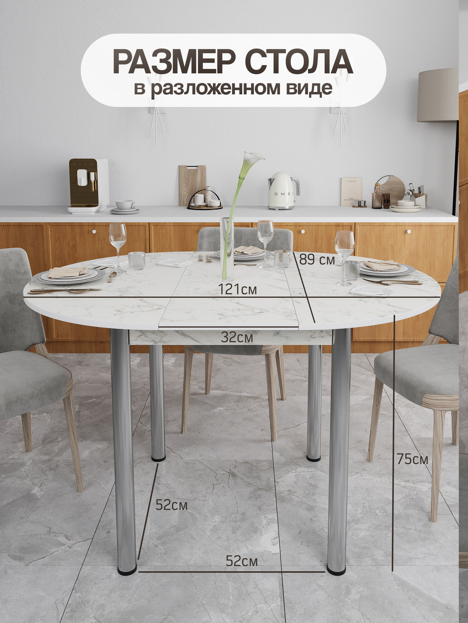 Кухонный стол раздвижной круглый - популярная и гармоничная модель. Этот стол раздвижной обеденный отлично впишется в любой интерьер и придаст ему уюта. Эргономичная круглая форма, хромированные опоры, качественная фурнитура выгодно выделяют этот круглый раскладной стол среди других. Плотная 1 мм ПВХ кромка обеспечит защитой торец столешницы.