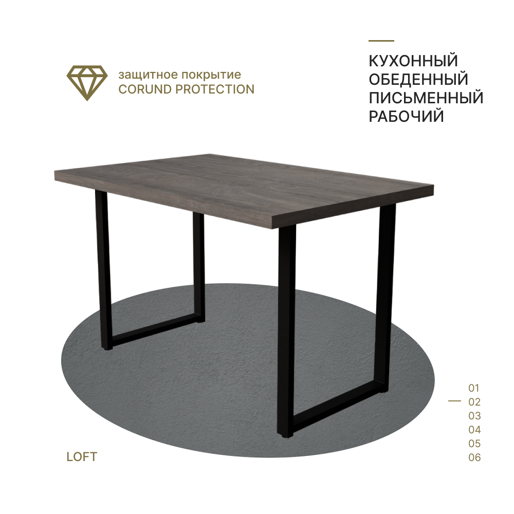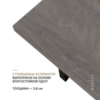 Дизайн стола выполнен на стыке нескольких направлений: лофт, классика и минимализм. Прямолинейность форм и устойчивость конструкции в совокупности с толстой столешницей, которая имитирует слэб натурального древа или камня, подарят своему обладателю комфорт, качество, чувство надежности.