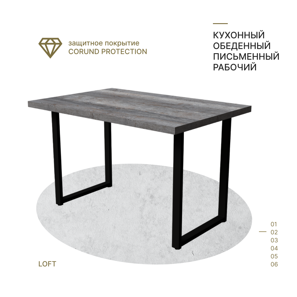 Дизайн стола выполнен на стыке нескольких направлений: лофт, классика и минимализм. Прямолинейность форм и устойчивость конструкции в совокупности с толстой столешницей, которая имитирует слэб натурального древа или камня, подарят своему обладателю комфорт, качество, чувство надежности.
