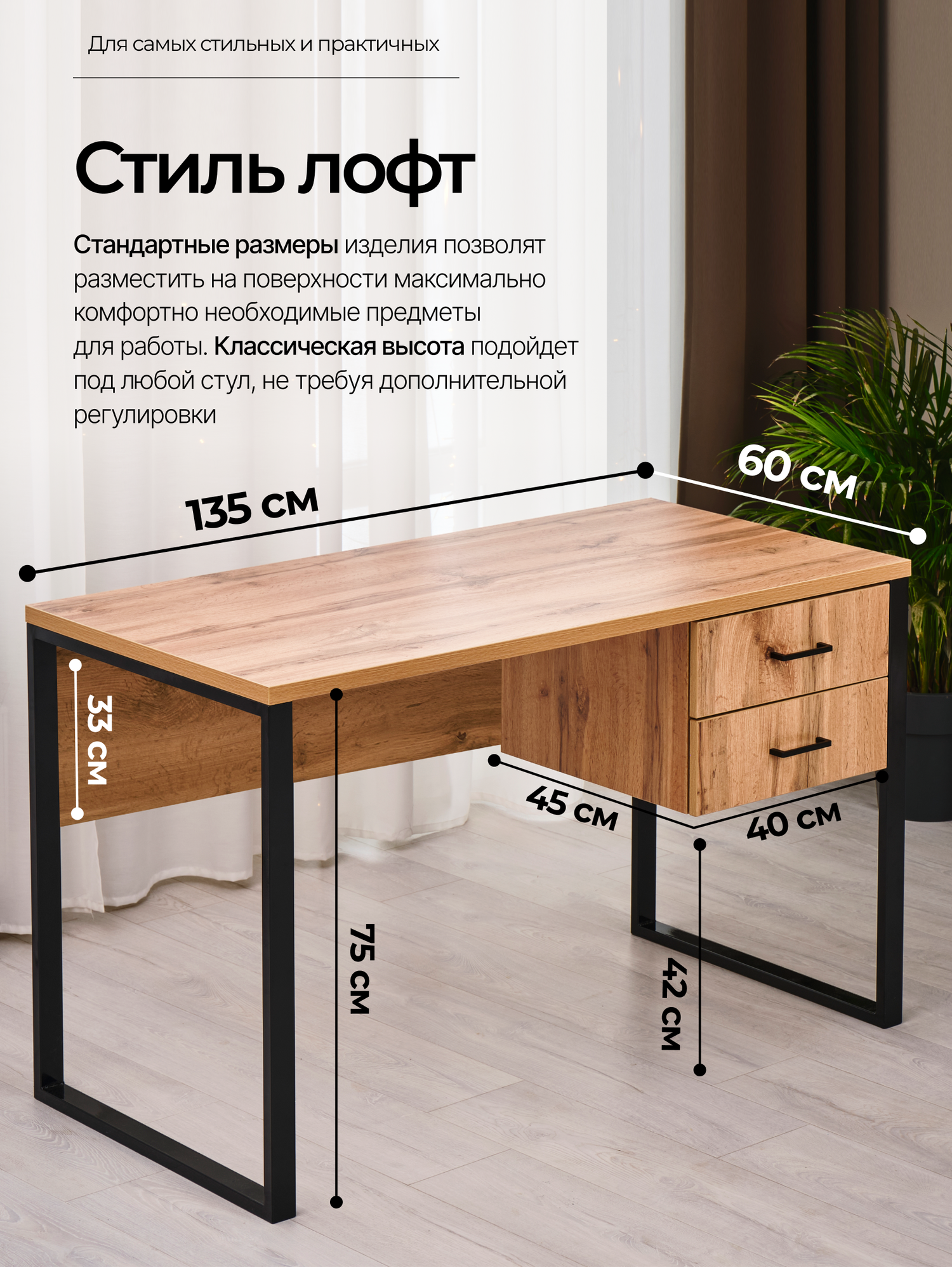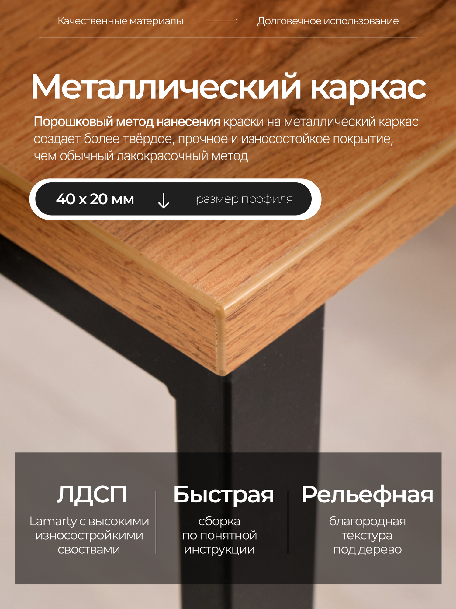 Размеры стола (ДхШхВ): 135х60х75 см. Столешница изготовлена из высококачественного ЛДСП компании Lamarty толщиной 26 мм, края обработаны ПВХ кромкой, толщиной 2мм. Поверхность столешницы обладает устойчивостью к воздействию моющих средств, стойкостью к стиранию, царапинам и выцветанию. В столешнице предусмотрены отверстия для вкручивания болтов с металлическими закладными, что позволяет добиться максимальной устойчивости. Подстолье состоит из двух сварных ножек, изготовленных из металлической трубы 40х20х1,5 мм и покрашено порошковой краской. В комплект фурнитуры входят 4 пластиковых подпятника, благодаря которым можно поставить стол даже на неровном полу и не испортить напольное покрытие.