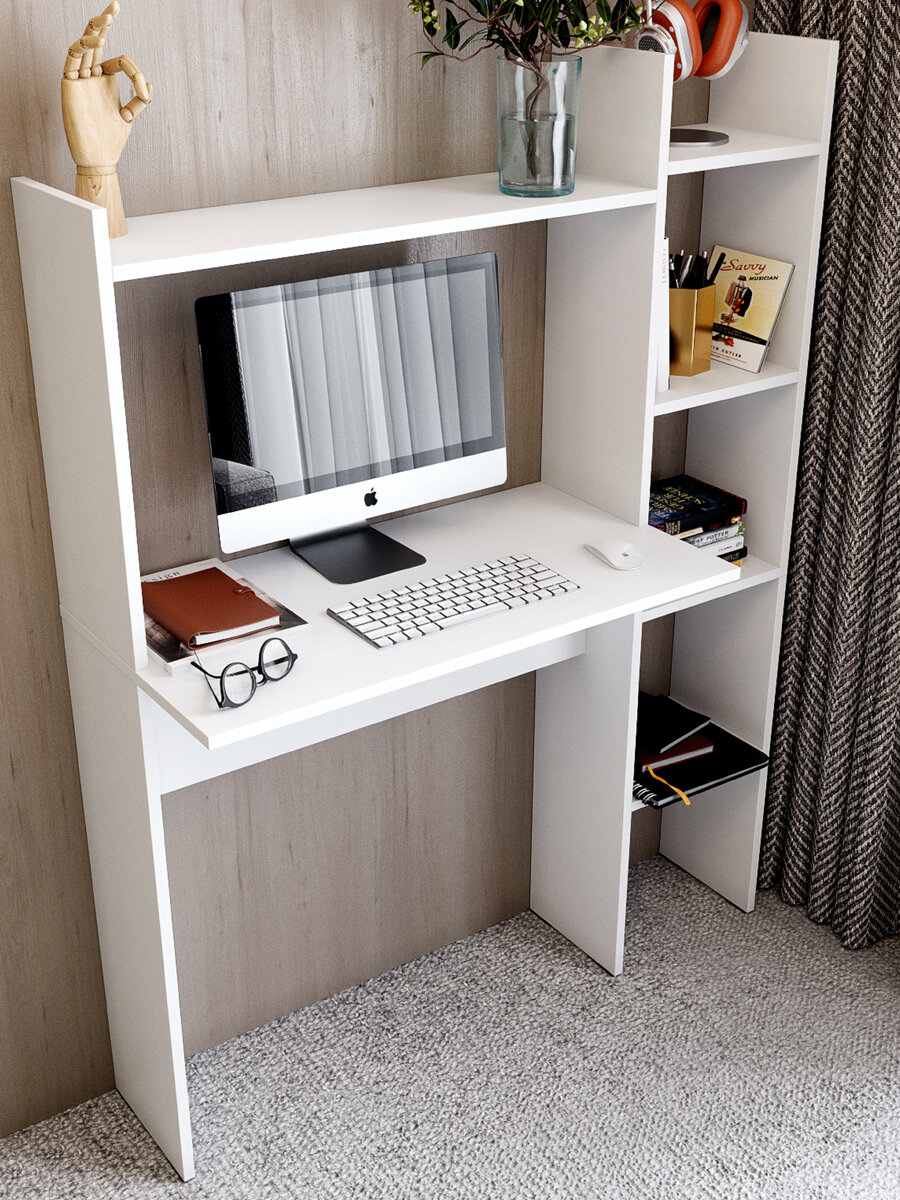 Стол письменный белый № 3 Эко – это практичное и стильное решение для обустройства рабочего пространства. Проверяйте комплектацию при получении! Стол универсальный, в зависимости от стеллажа, может быть собран в правом, и левом исполнении. Изготовлен из прочного ЛДСП, он отличается лаконичным дизайном, который впишется в интерьеры в стиле лофт, классика или детский. Прямоугольная столешница предоставляет достаточно места для работы, учебы или творчества, а три ножки обеспечивают устойчивость конструкции. Стол приставной станет отличным выбором для детской комнаты, офиса или гостиной. Стол белый письменный имеет лаконичный стиль и прекрасно впишется в любой интерьер, будь то классический кабинет или современный офис. Благодаря своей универсальности, этот стол станет отличным дополнением к любому рабочему пространству. Стол компьютерный оснащён всем необходимым для комфортной работы. В нём предусмотрены полки для хранения документов, канцелярских принадлежностей и личных вещей, а также удобная столешница для размещения монитора или ноутбука. Это позволяет оптимизировать рабочее пространство и сделать его максимально удобным. Стол письменный для школьников будет прекрасным приобретением к 1 сентября, он занимает не много места и комфортен для размещения учебников и необходимых предметов для обучения. Стол подойдет как туалетный столик для удобного хранения косметики, украшений и других аксессуаров. Стол со стеллажом - это практичное решение для организации рабочего пространства, сочетающее в себе функциональность письменного стола и системы хранения.
